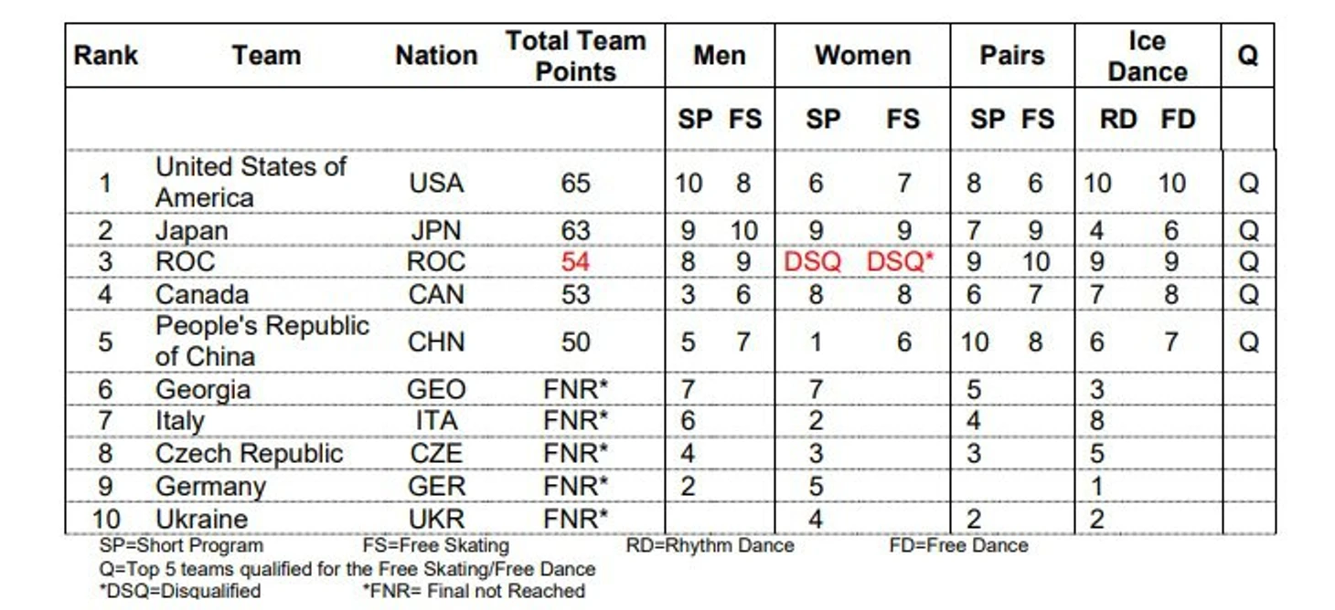 Она также дисквалифицирована в женском личном турнире Олимпийских игр-2022 в Пекине, а все ее индивидуальные результаты и очки в короткой и произвольной программах буду аннулированы, что приведет к пересмотру результатов командных соревнований следующим образом:
