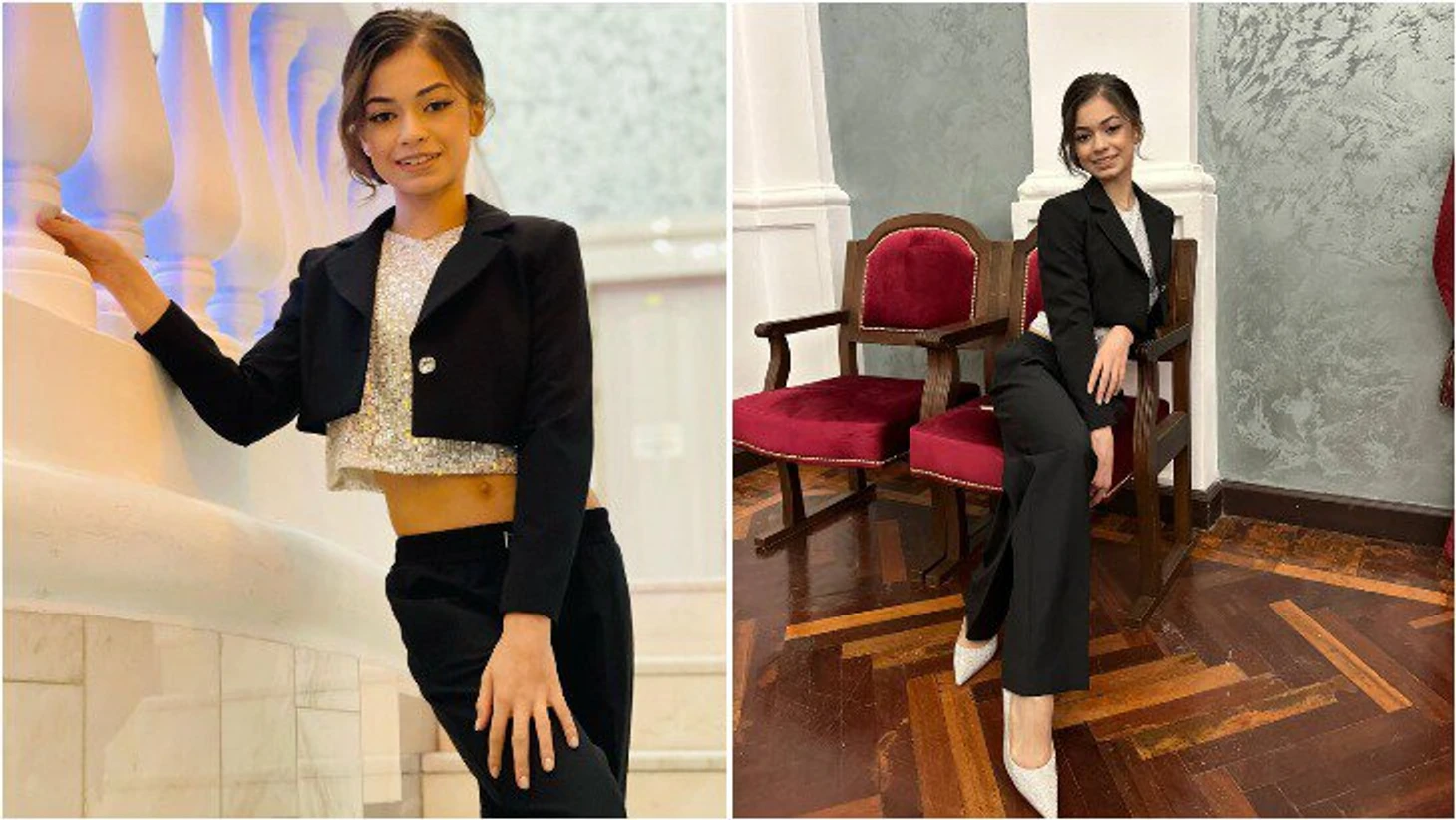 Аделия Петросян в стильном брючном костюме с укороченным пиджаком и серебристым топом.