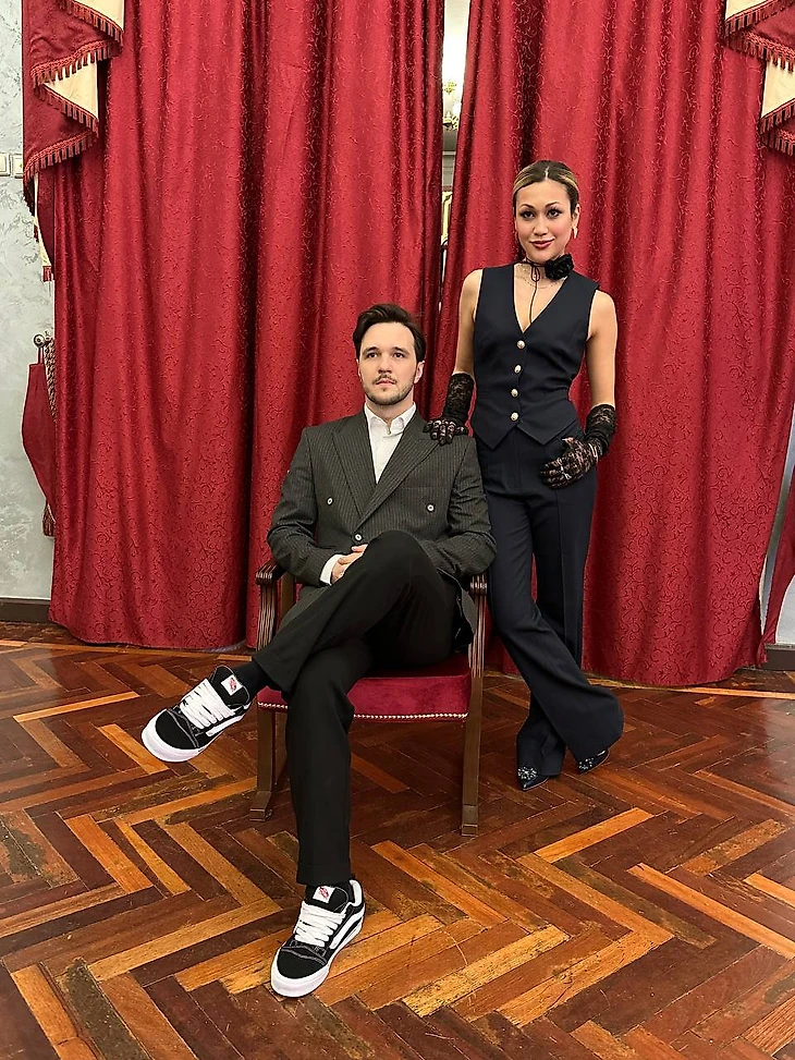 Елизавета Худайбердиева и Егор Базин и их разное прочтение классики. У него акцент на кедах, у нее – на перчатках из гипюра и трендовом украшении на шее.