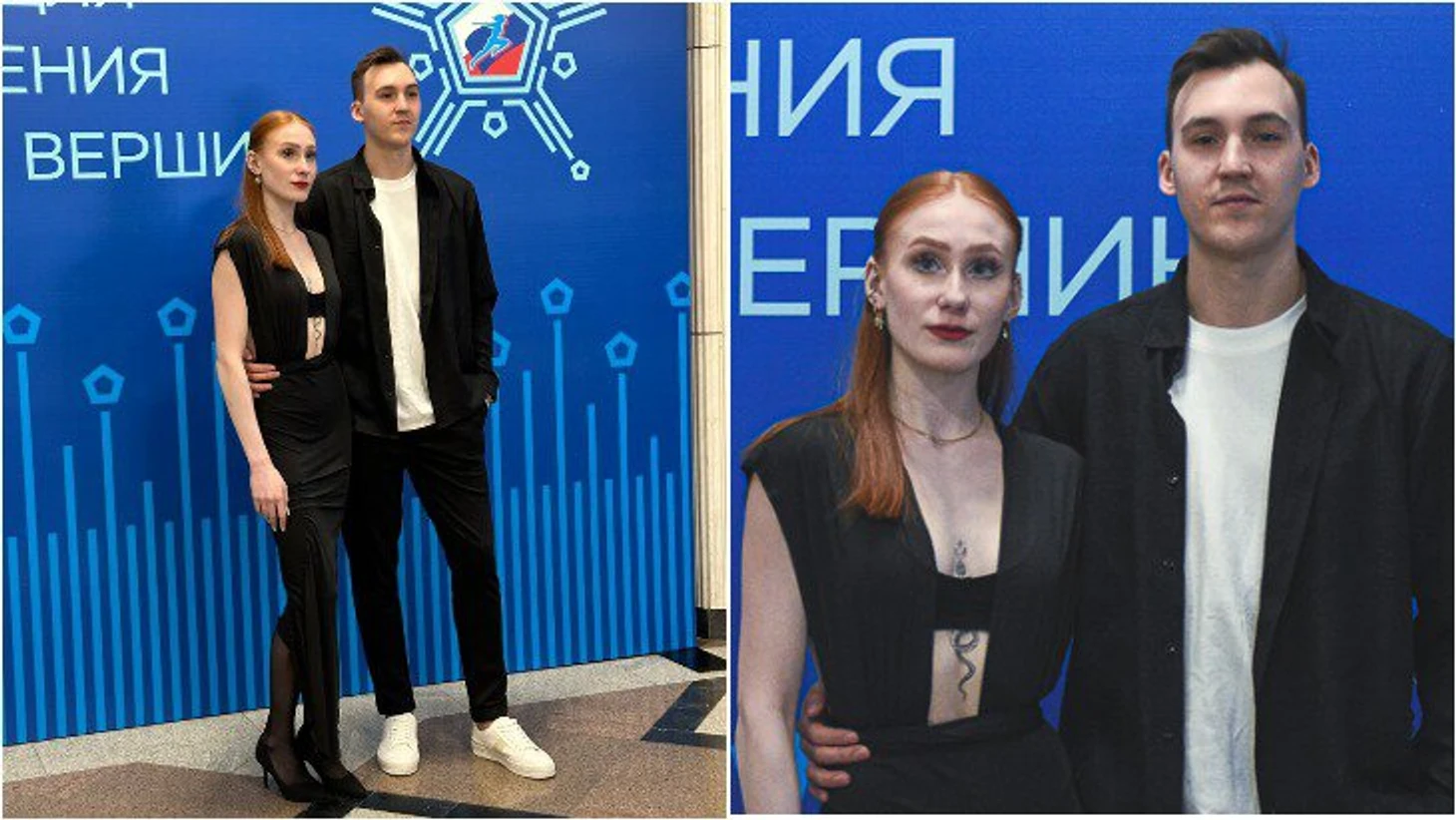 Елизавета Шанаева в черном платье с открытыми плечами и Павел Дрозд в рубашке в цвет.