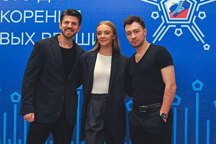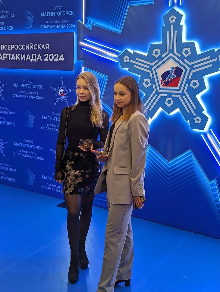 Ксения Гущина хоть и пошла по классической тропе, которую так любят фигуристы, но поиграла с цветом – надела бежевый костюм. София Захарова в черной мини-юбке.