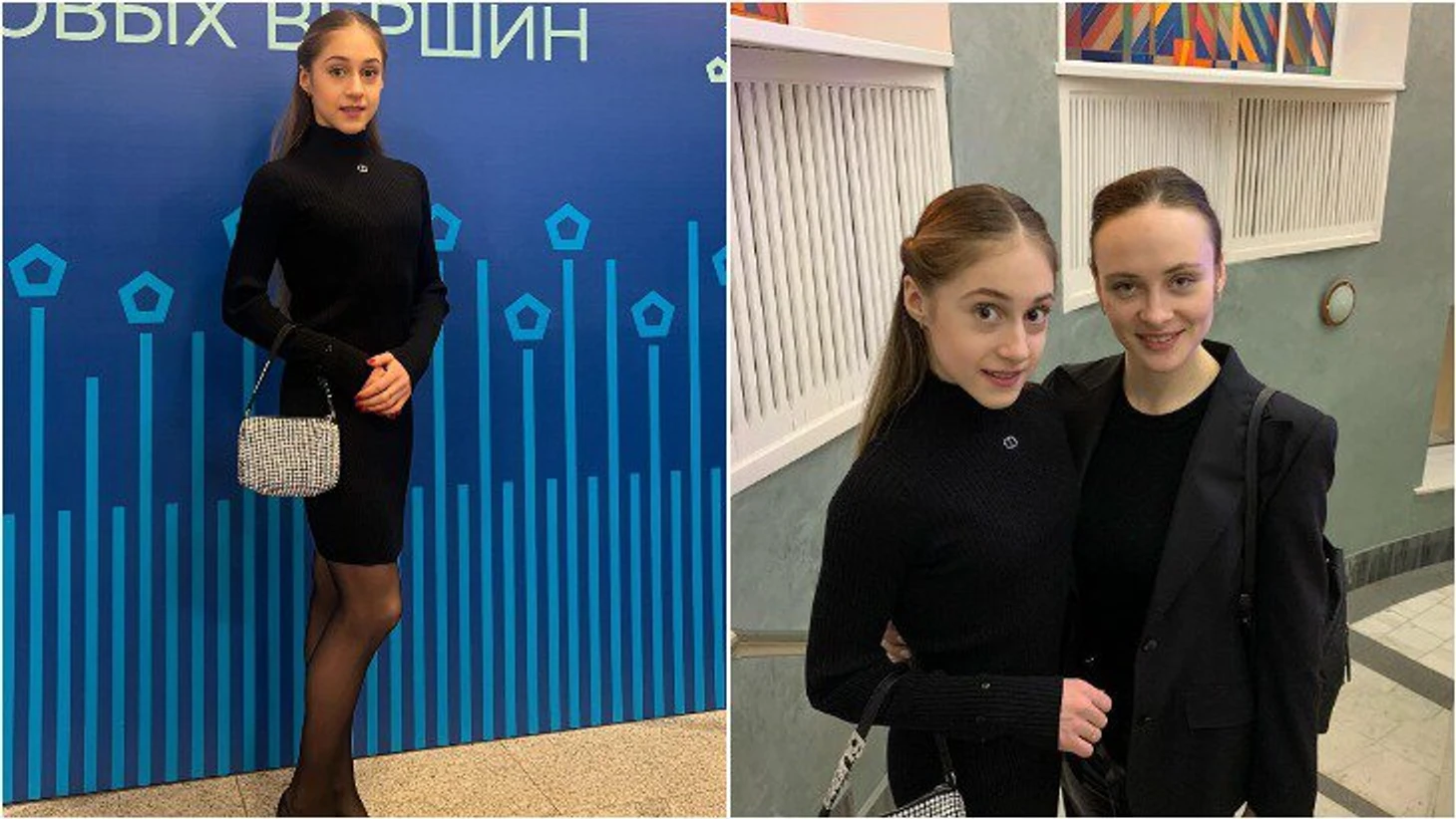 И Алина Горбачева в черном – с маленькой сумочкой и любимым тренером.