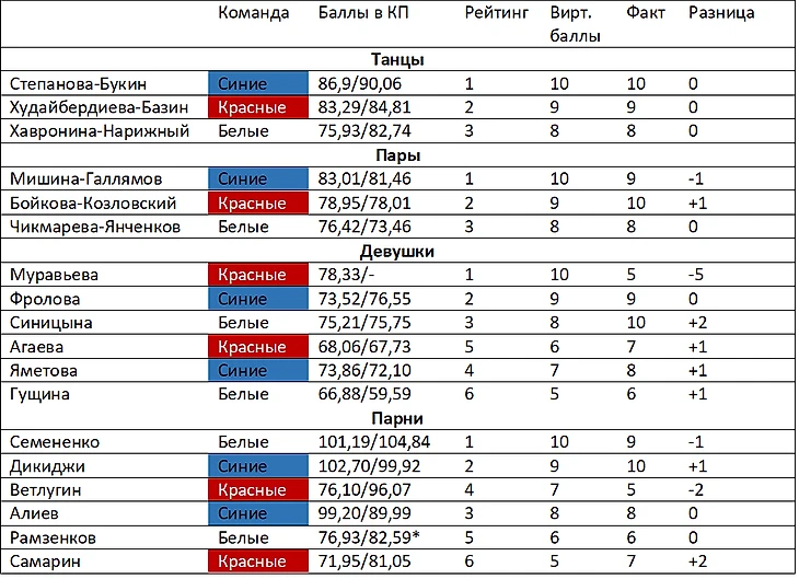 Я не учитываю результаты конкурсов элементов, но можете мысленно приплюсовать синим 1 балл и красным 2 балла, чтобы сошлась итоговая разница.