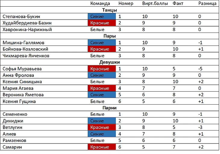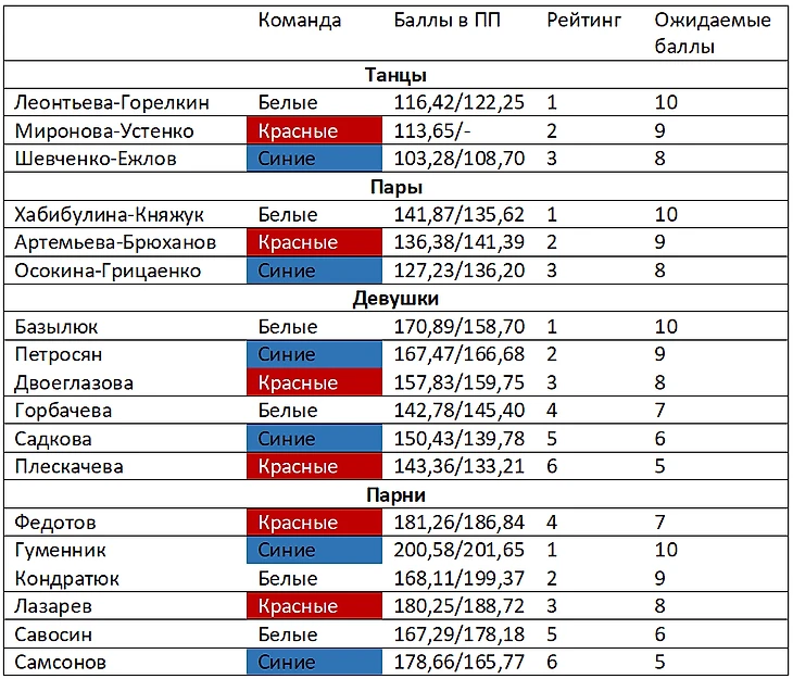Как видим, относительно заявленных сил лучше всего выступила команда Щербаковой – перевес обеспечила Яметова, откатавшая лучше сделанной на нее ставки, Дикиджи и Алиев также внесли свой вклад , а вот МиГи неожиданно расстроили, проиграв свою микродуэль БК. Команда Загитовой также выступила лучше, чем могла (не подведи Семененко, маятник качнулся бы в сторону синих) – перевес обеспечили Синицына, выигравшая свою микродуэль у Фроловой, и Гущина, поднявшаяся на одну строчку выше из-за провала Муравьевой, а вот у парней Семененко недосчитался балла. Команда Туктамышевой выступила сильно хуже теоретически ожидаемого, в первую очередь из-за неудачного проката Муравьевой. Провал Ветлугина, как ни странно, не оказал такого значительного влияния на распределение баллов, т.к. за счет этого вверх взлетел Самарин, который выиграл свое противостояние с Рамзенковым.