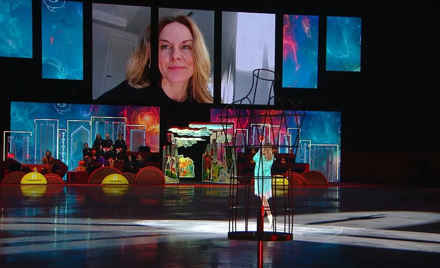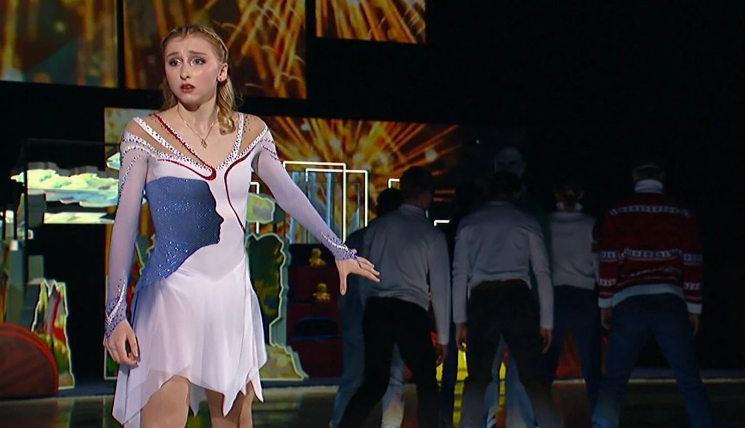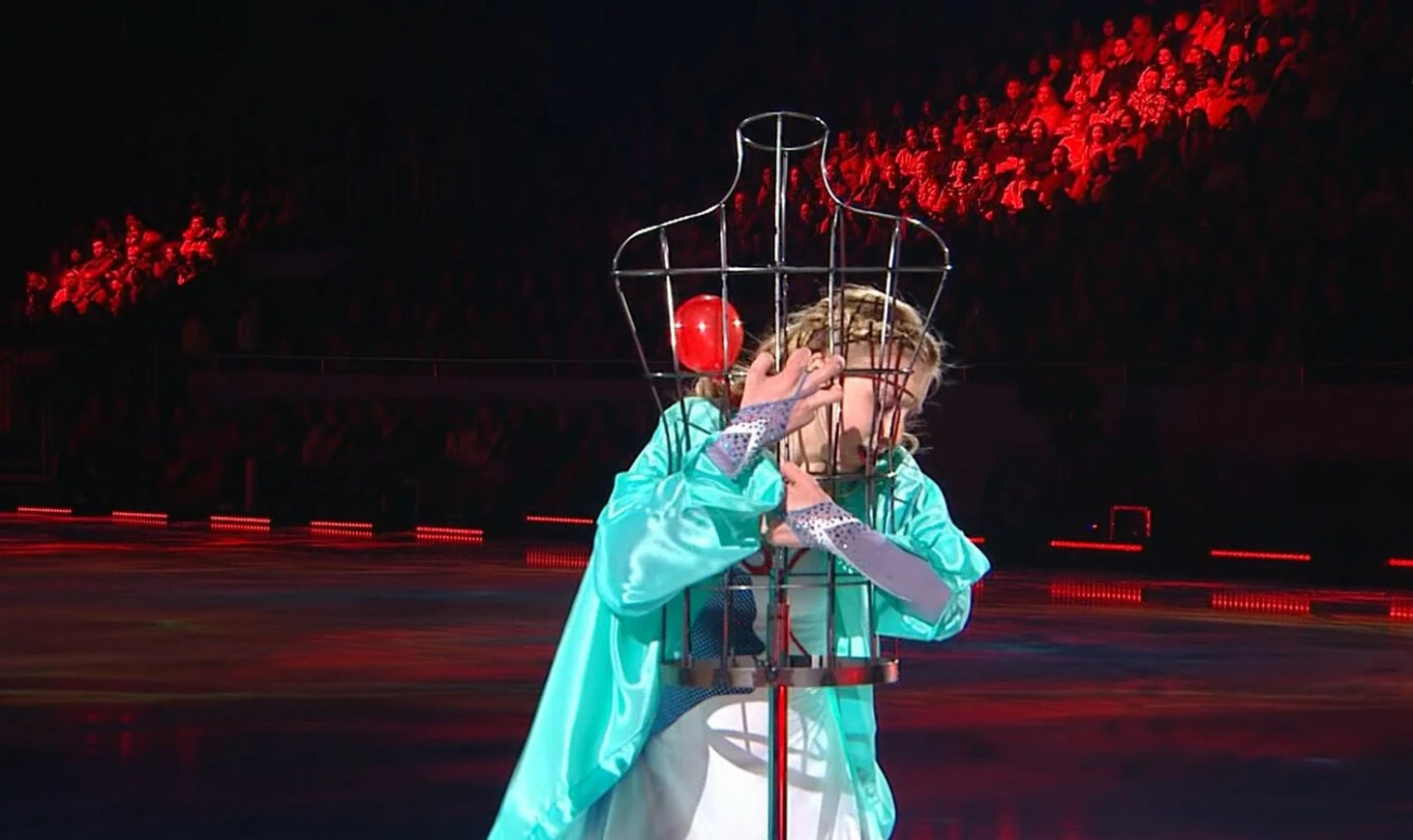 В это время на льду Муравьева в образе партнерши, рядом – партнер в рубашке, напоминающей ту, в которой Гриньков выигрывал Игры-1988 в Калгари. Их разлучают и дальше становится ясно, что номер будет о потере и памяти.