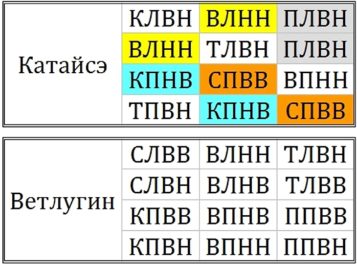 Катайсэ — 4 блока из 8 поворотов. У Ветлугина ни одного повторения по ноге или ребру, кстати, направление поворотов, третья буква в каждой аббревиатуре, оставалось прежним, как и нога для одноимённых блоков. Интересны оба варианта.