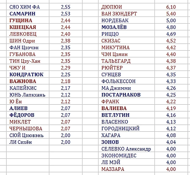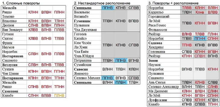 Такая структура для сравнения, например, у Валиевой и Важновой 16 поворотов, но их состав - 6 против 0, поэтому Камила в общей таблице находится внизу, но по «редкости» входит в десятку среди женщин: