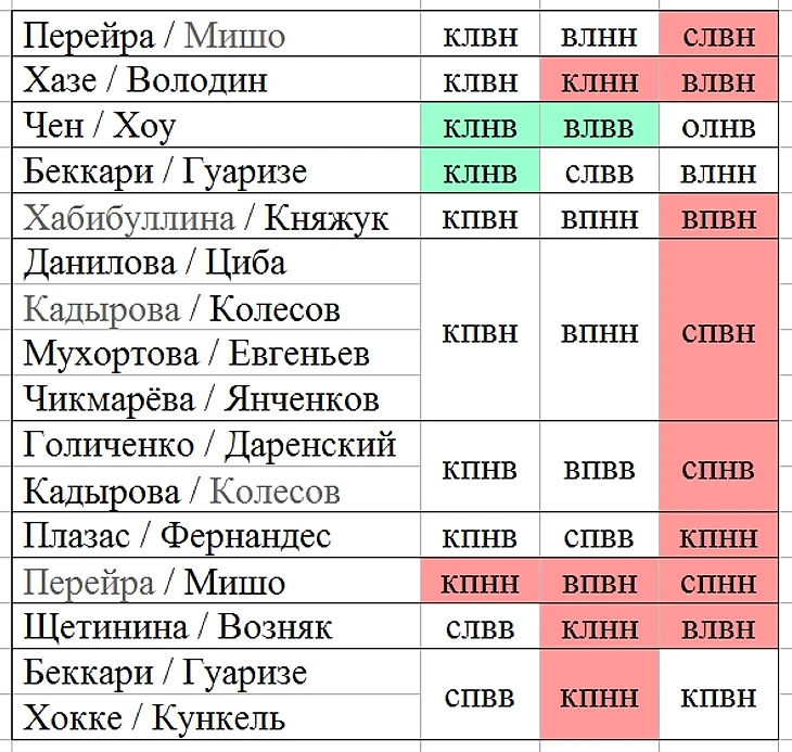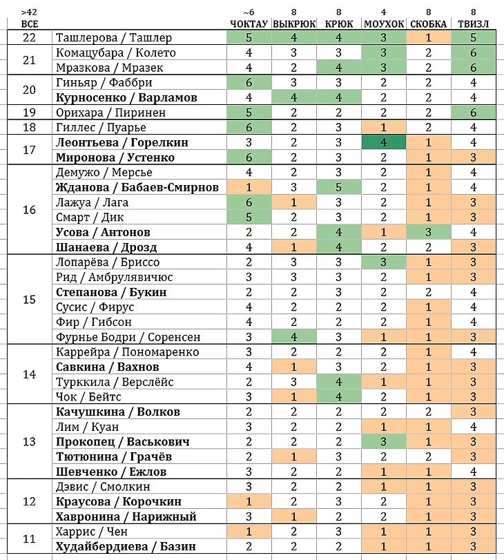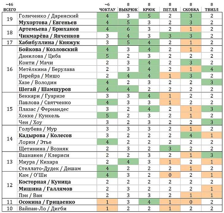 Была мысль каждого партнёра считать по отдельности, например, у Степановой / Букина есть крюк и скобка назад-наружу (редкие), оба поворота у Ивана. Пока что решила не делить пары, если дело касается не блоков.