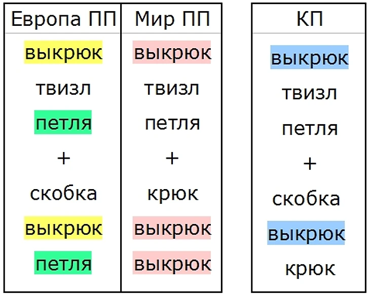 1. Типичное расположение «крюк/скобка + выкрюк + петля/твизл», но редкие по ноге-направлению-ребру, вроде скобок не вперёд-внутрь. В таблице отмечены красным шрифтом.