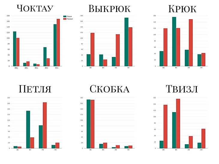 Ещё один факт: самые частые повороты в блоках выкрюк-левая-назад-наружу (251) и скобка-левая-вперёд-внутрь (148). Самые редкие: