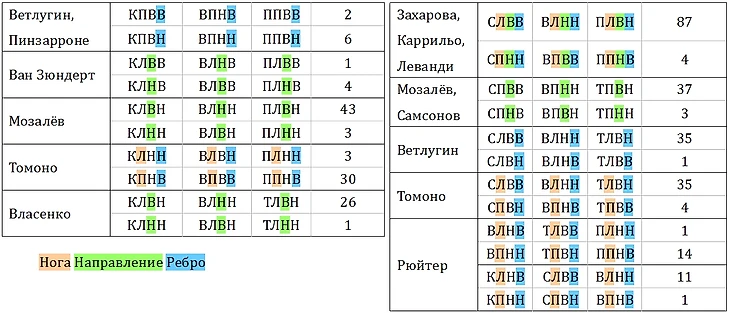 А теперь обратите внимание на красные ячейки в двух таблицах: у большинства есть 2 скобы и 2 петли, самый минимум. Но петли всегда разные, выбирают из 4 видов: левая или правая вперёд-наружу + левая или правая назад-внутрь (все есть у Городницкого в гифе выше). Это небольшое, но всё же разнообразие, по скобкам всё значительно скромнее, большинство ограничилось вперёд-внутрь на обеих ногах. Есть даже два фигуриста с 5 петлями, Ле Мэй и Чиба, но 5 скоб нет ни у кого. Ван Зюндерт и Бричги немного отличились — с двумя скобками, но не сделали одну из СВВ, и Дюпюи — у неё только СНВ на обеих ногах. Те, кто сделал больше 2 скоб, естественно, использовали редкие варианты.