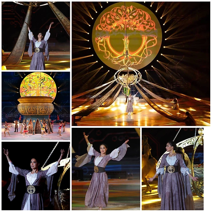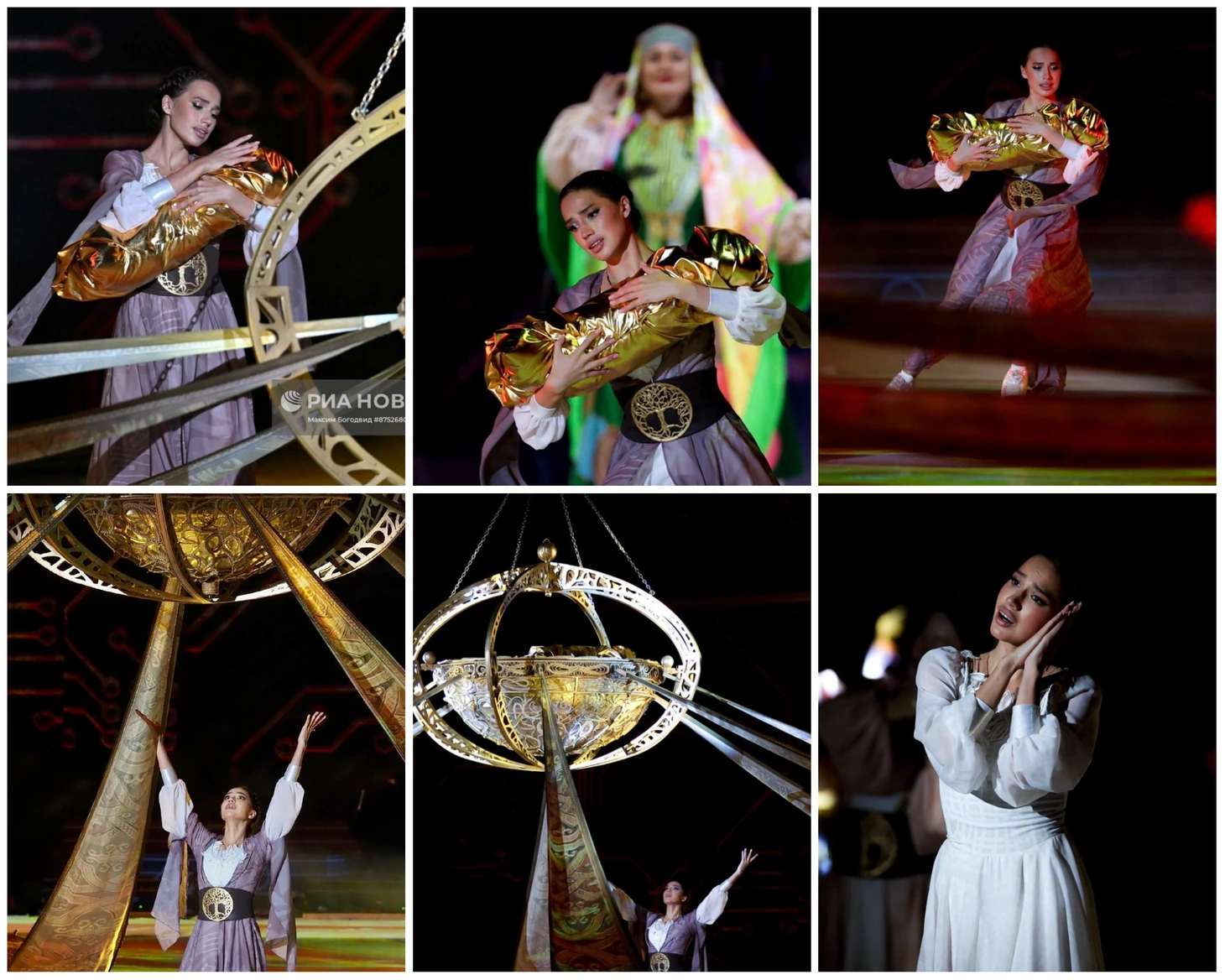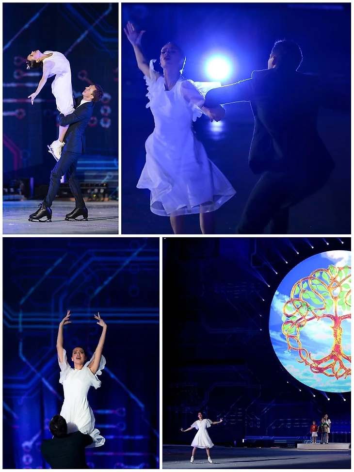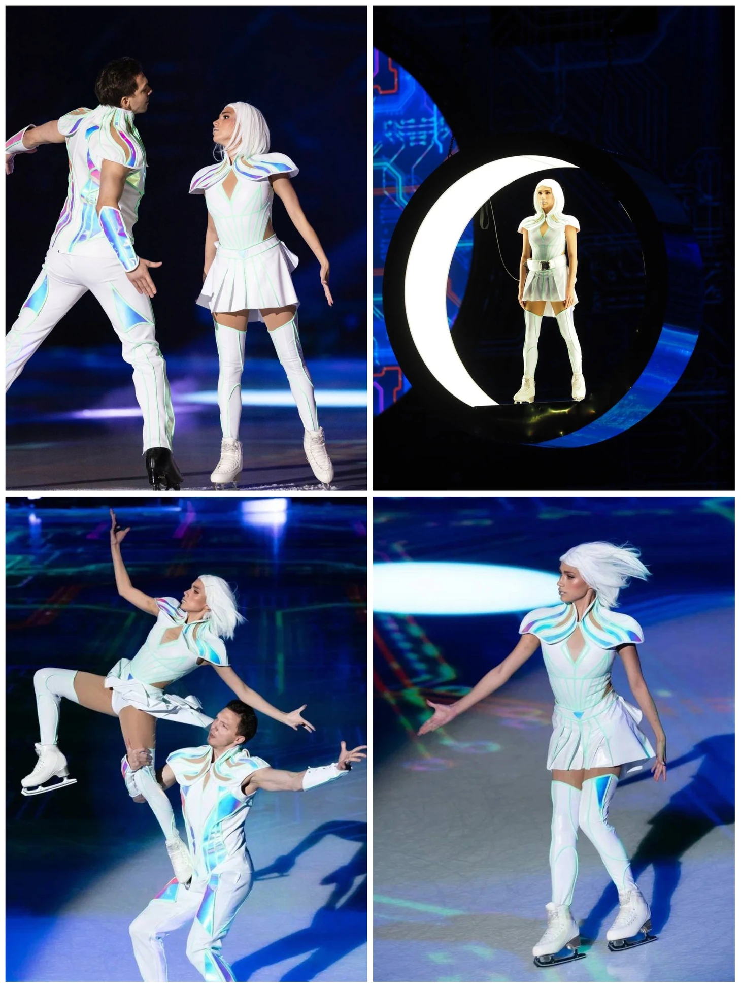 В первых сценах «гости из будущего»,как я их назвала, (Алина Загитова и ее партнер по шоу, Дмитрий Соловьев), спускаются к нам из космоса-под купола ледового дворца в светящихся сферах, и переносят нас, зрителей, в мир древности, в котором существуют мифы и легенды, древние племена и герои татарского фольклора.
