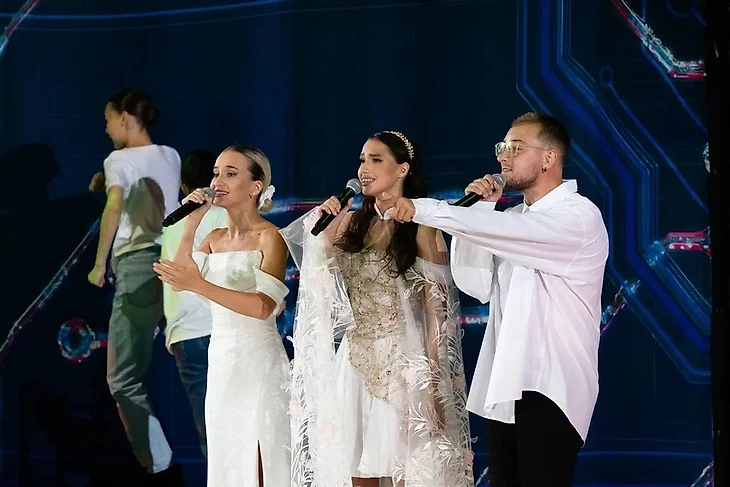 В финале шоу нас ждал еще один сюрприз, о котором рассказывала Алина, и который нам очень хотелось поскорее увидеть и услышать – это финальная песня, гимн «Хранителей времени», одной из исполнительниц которого стала сама Алина. Вместе с ней гимн исполнили молодые композиторы и исполнители музыкальных партий этого шоу: Олег Сидоров и Анастасия Белявская.