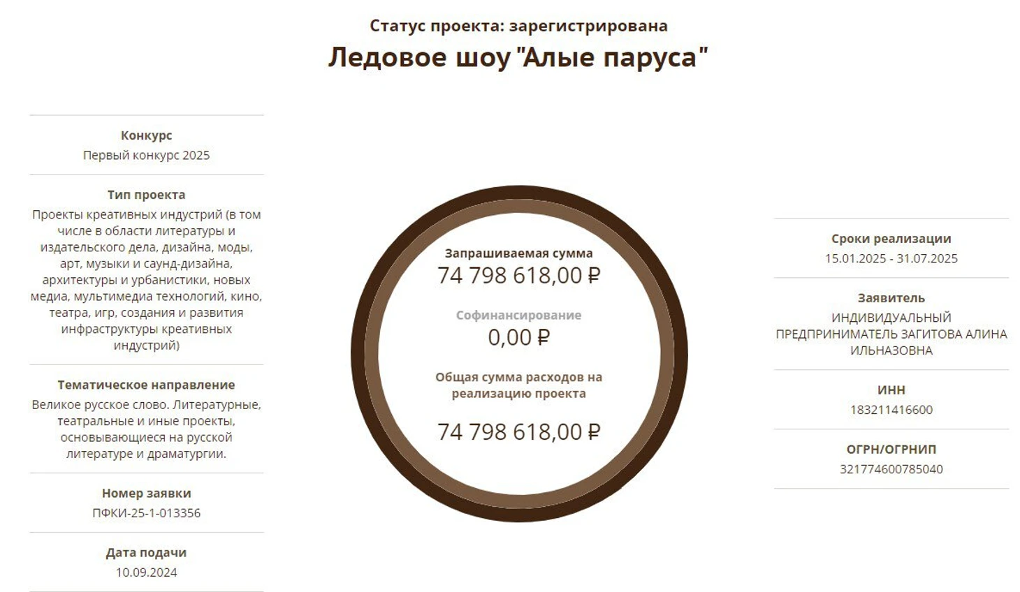 Алина хочет 74,798 млн рублей на создание ледового шоу «Алые паруса» – заявка проходит по тематическому направлению «Великое русское слово. Литературные, театральные и иные проекты, основывающиеся на русской литературе и драматургии».