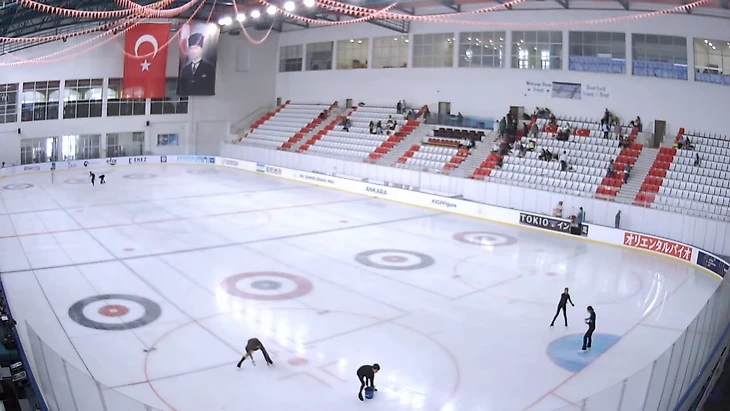 Так выглядит арена Ümitköy Sports Complex на юниорском Гран-при – с разметкой для хоккея и керлинга на льду. Зрителей совсем мало.