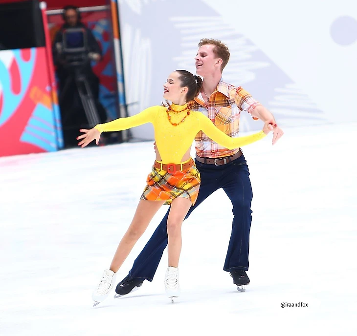 Ритм-танец сам по себе хорош тем, что узнаваемая и в большинстве случаев зажигательная музыка способна хоть как-то раскачать зал, особенно, если танцы на льду становятся заключительным видом в день прокатов, когда зритель если не уходит с трибун, то значительно утомляется от конвейера не всегда разнообразных постановок. Исходя из тематики и временного промежутка ритм-танца этого года, мы трижды услышали Пресли, единожды - Битлз и... «Песняров» в исполнении Анны Щербаковой и Егора Гончарова! Хочется выразить ребятам отдельную благодарность за неожиданный и очень приятный сердцу выбор, который уж точно выделился на фоне остальных композиций и был тепло встречен публикой (да и наверняка в мыслях многих всплыла сцена, где Волк из «Ну, погоди!» едет на тракторе по полю). Когда бы мы ещё услышали белорусский язык на льду, если не сейчас? Кстати, на одном из интервью танцоры признавались, что очень хотели бы оказаться на одном льду и даже в одной разминке с Чемпионами России Александрой Степановой и Иваном Букиным -- и на этих прокатах их мечта осуществилась!