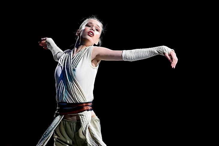 Новый шоу-номер сделали под мэшап из хитов Рианны. Поставили женственную хореографию с элементами джаз-фанка и пошили костюм в духе Луны Хендрикс – черные леггинсы с гипюровыми вставками и усеянный камнями кроп-топ.