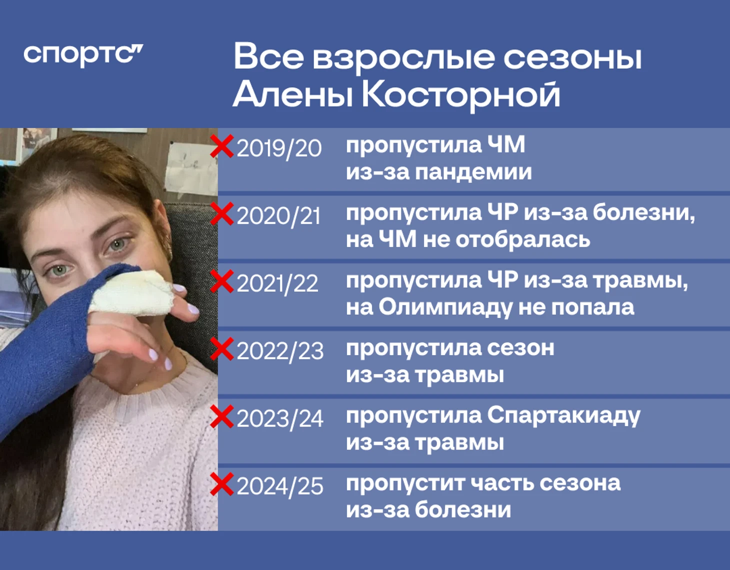 Забегая вперед: для Косторной это был единственный сезон, когда она физически могла закрыть все старты, но помешали внешние причины.