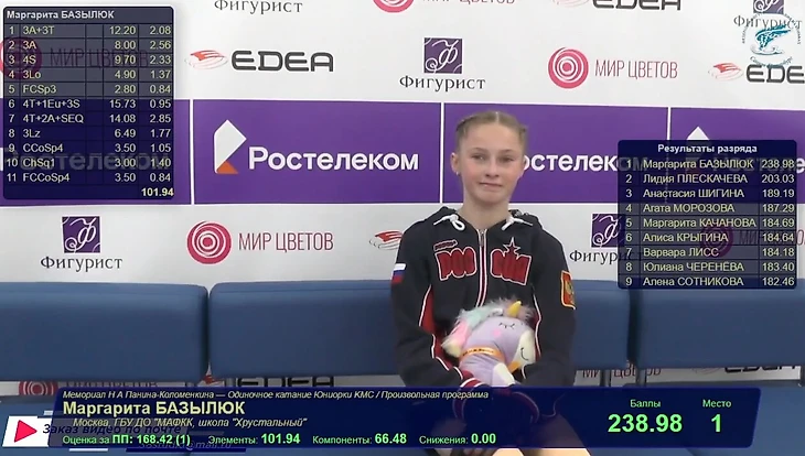 168,42 – впечатляющие баллы за произвольную. Хотя в прошлом году Маргарита набирала больше – на первенстве России было 170,89 балла даже с одним трикселем. Но это был главный старт для юниоров, Базылюк набрала топ-форму. А тут – самое начало сезона.