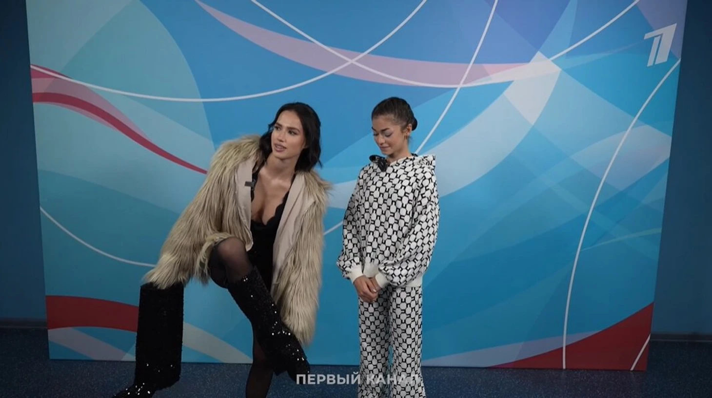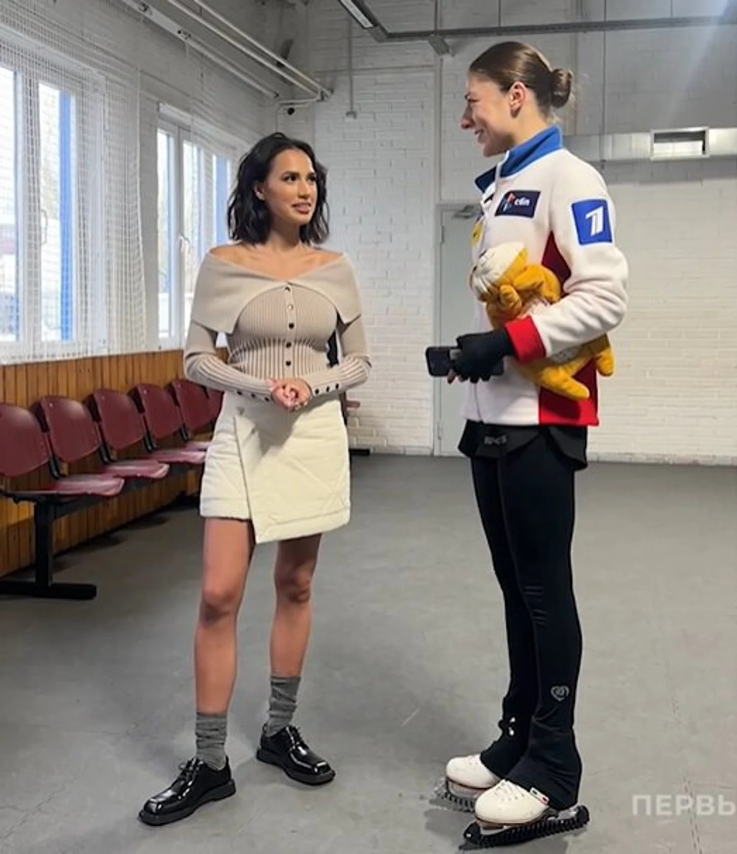 Хотя во время интервью с Аделией Петросян Алина сняла с себя и блестящие сапоги – чтобы не возвышаться над фигуристкой.