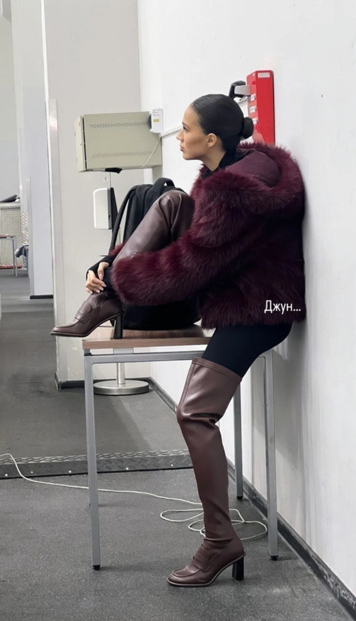 Остальные образы сибирского этапа оказались более классическими. Коричневая вельветовая юбка и черная меховая куртка от Love Republic за 13 тысяч, а под ней – легкая блуза с леопардовым принтом.