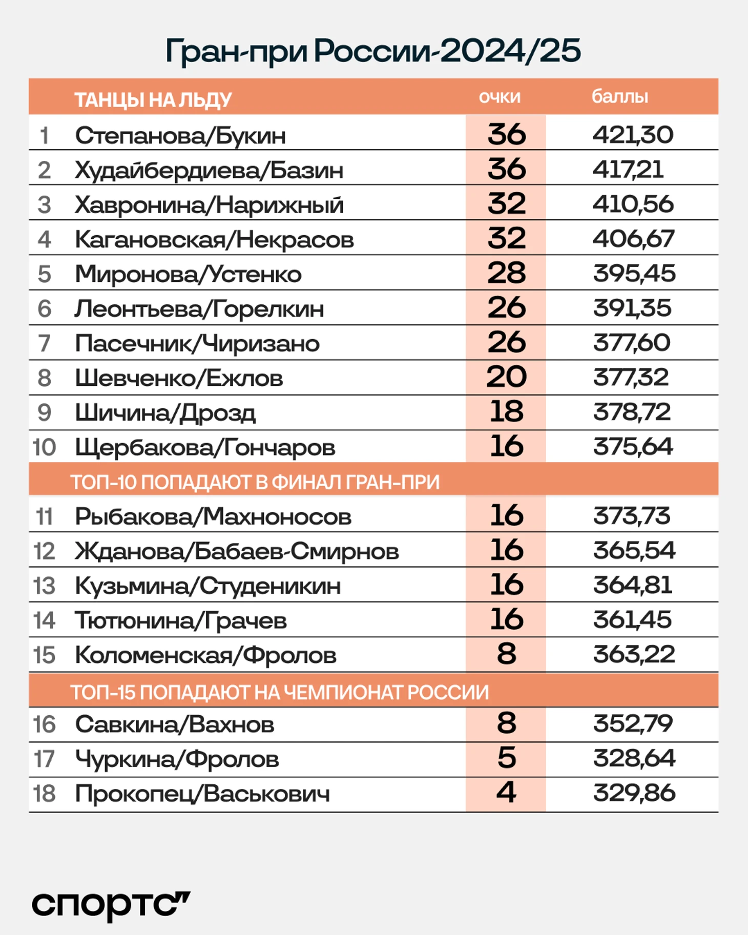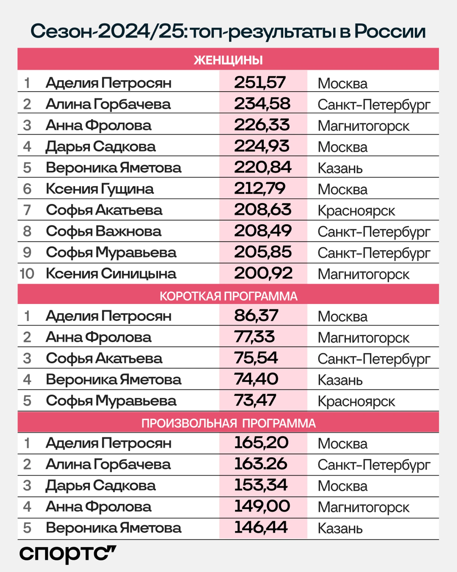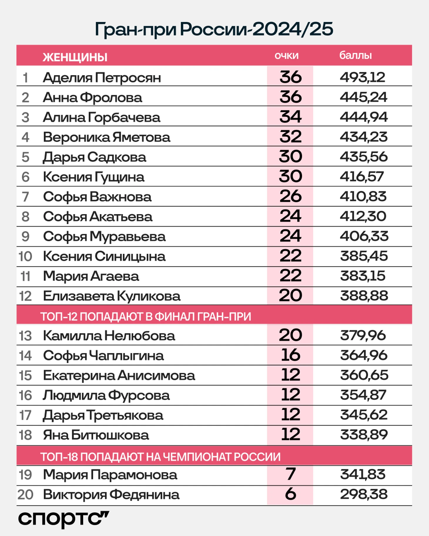 ● Аделия Петросян второй сезон подряд лучшая в общем зачете, а отрыв от снова второй Анны Фроловой за год увеличился еще на 3 балла.