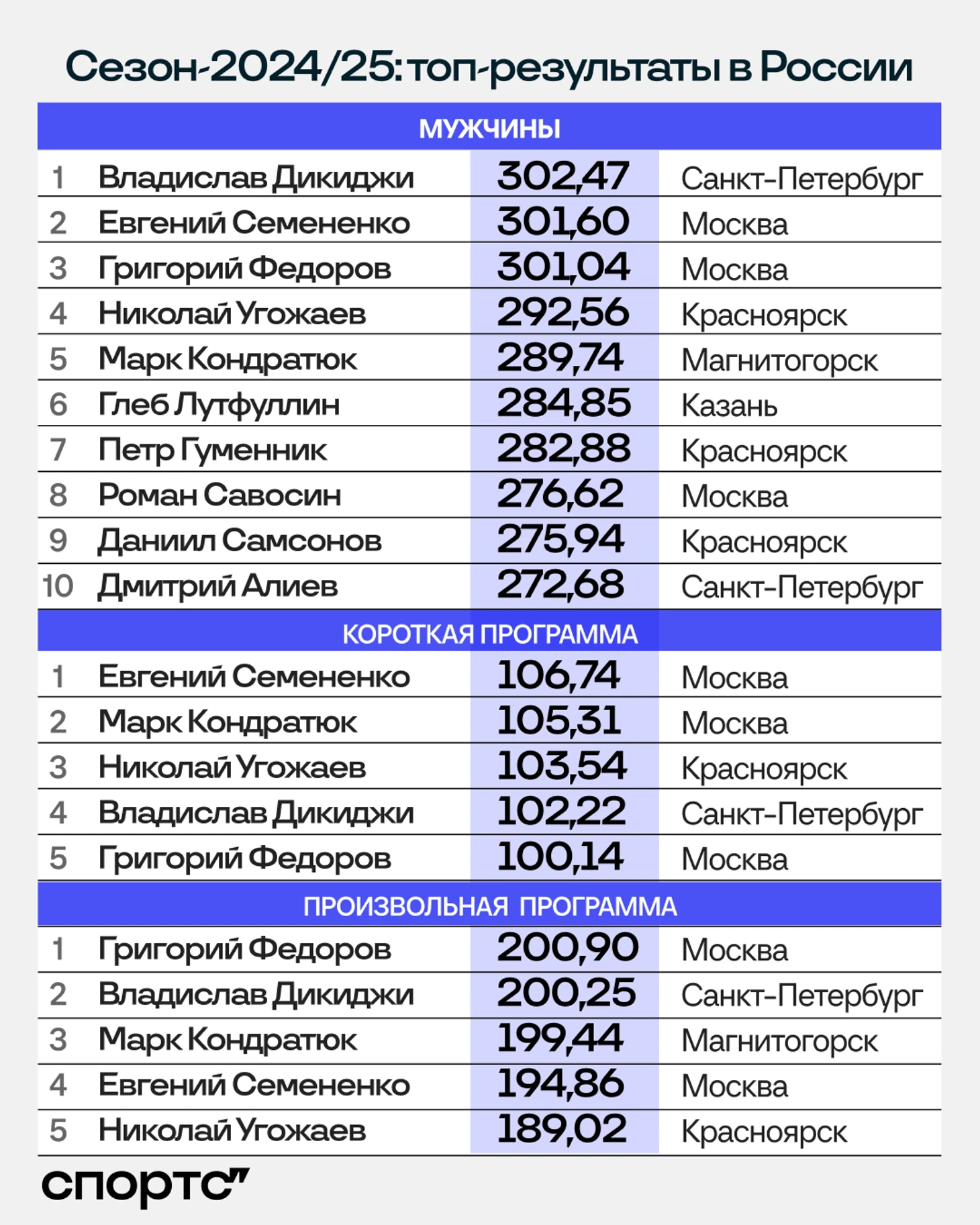 ● Семененко два года подряд становился вторым в общем зачете, но теперь третий – вслед за Дикиджи и Марком Кондратюком. Зато у Евгения лучшие баллы сезона в короткой (запредельные 106,74 на московском этапе) и вторые компоненты сезона в произвольной (выше только у Дмитрия Алиева).