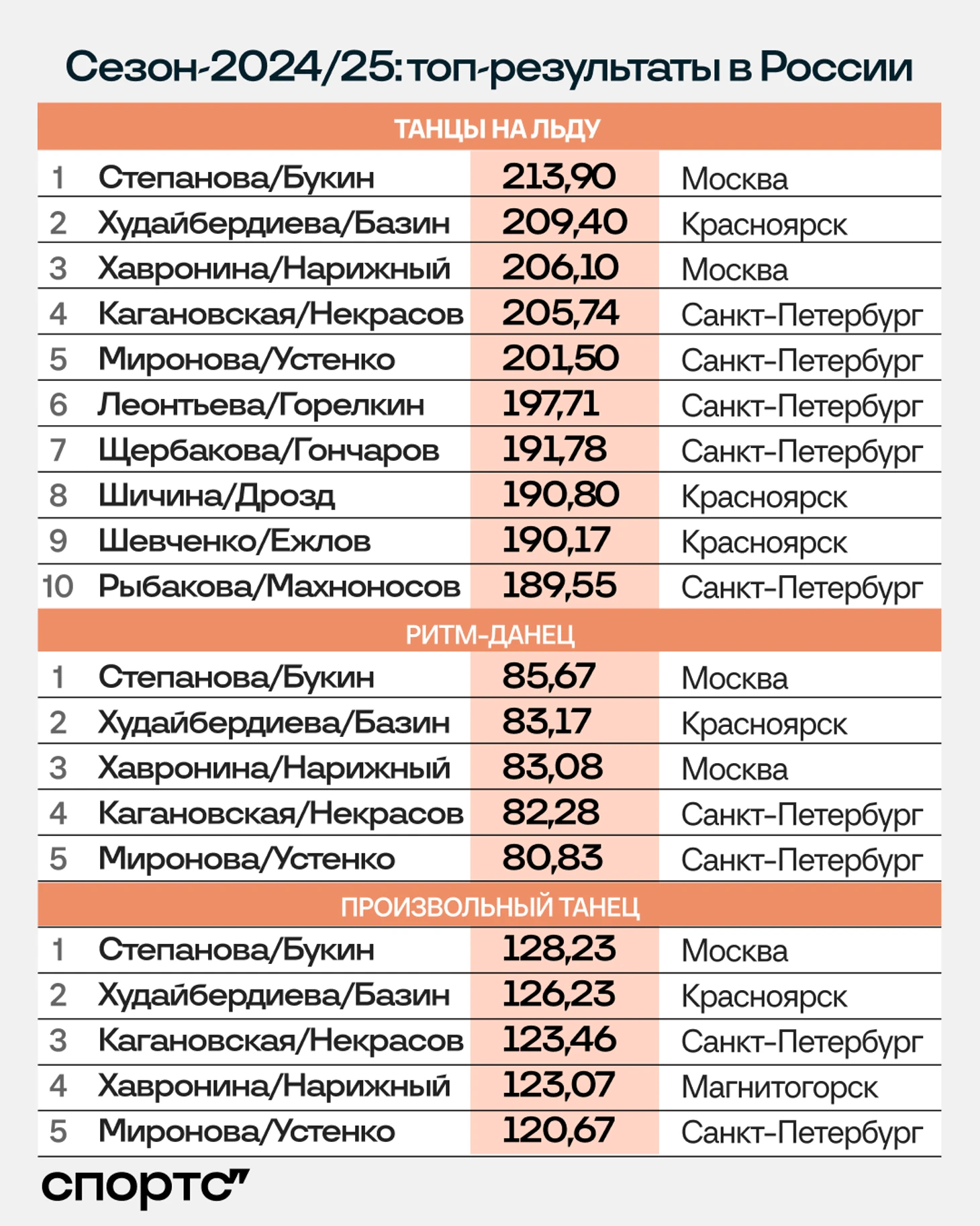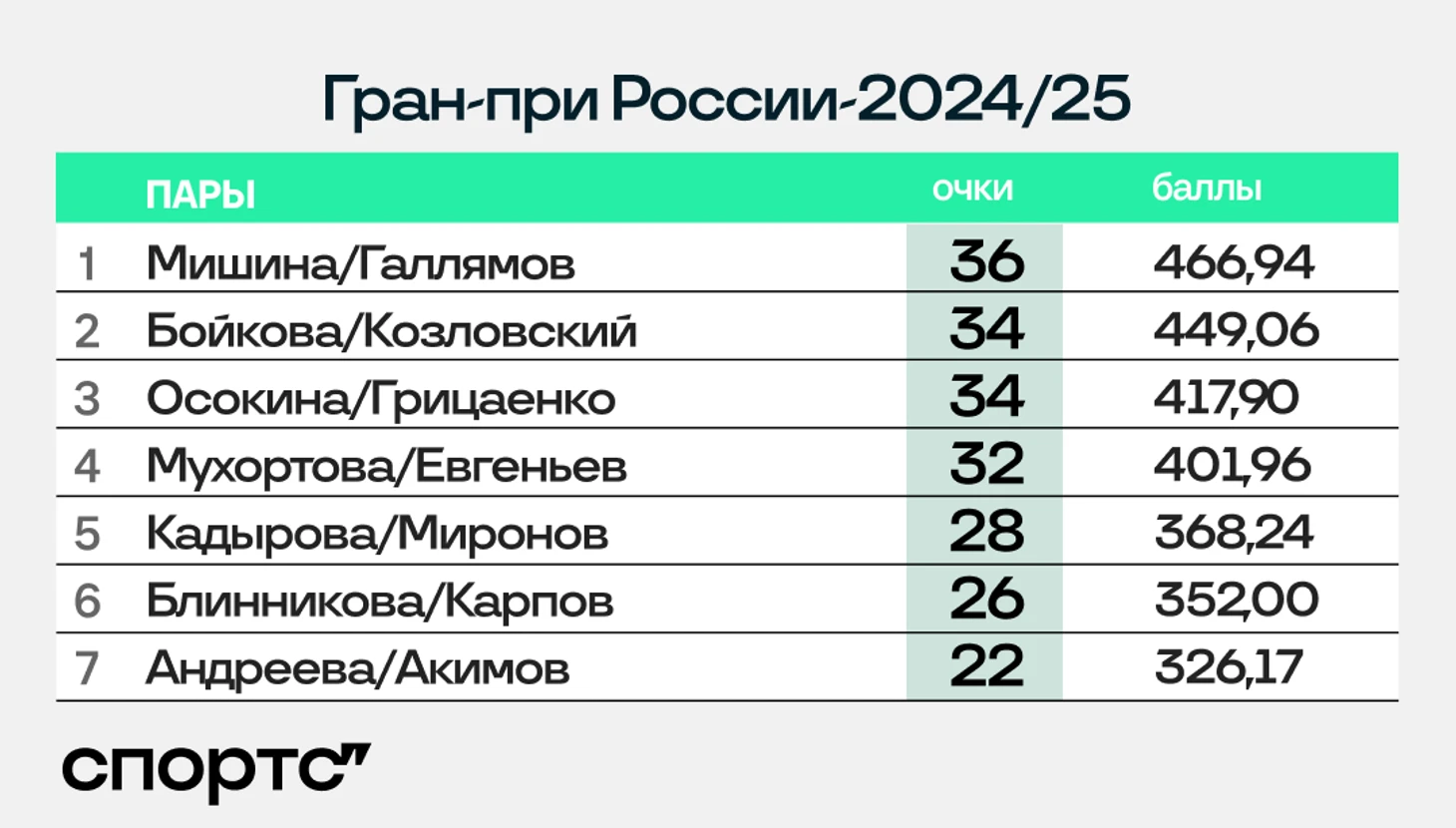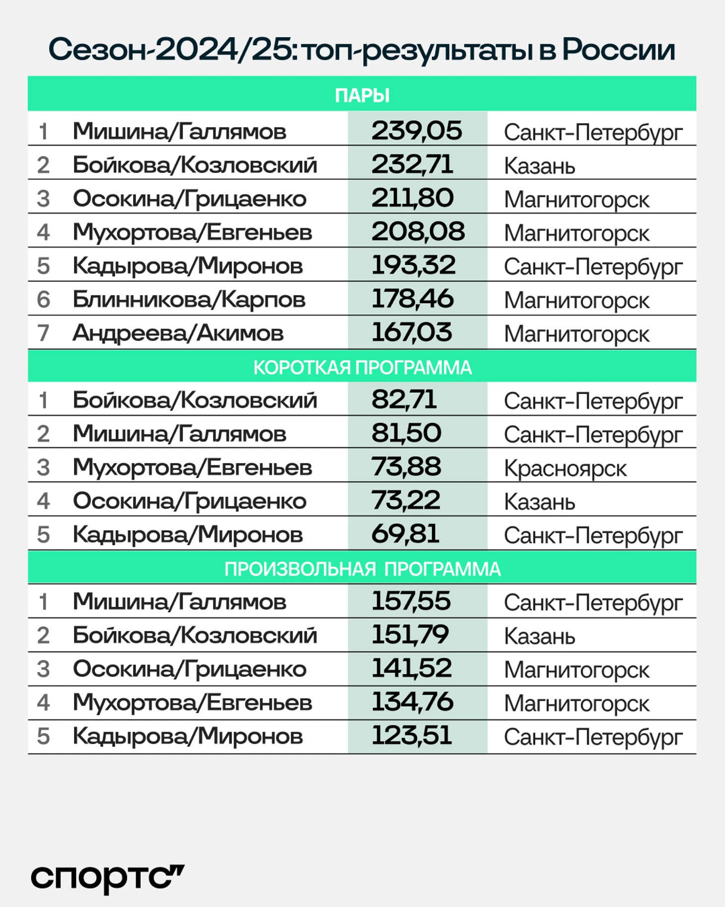 Со щитом снова ученики Тамары Москвиной – год назад они сначала заочно выиграли Гран-при, а затем очные баттлы на чемпионате России и в финале Гран-при. Продолжение последовало и в этом сезоне – у Мишиной и Галлямова лучшая сумма сезона и победа на питерском этапе.