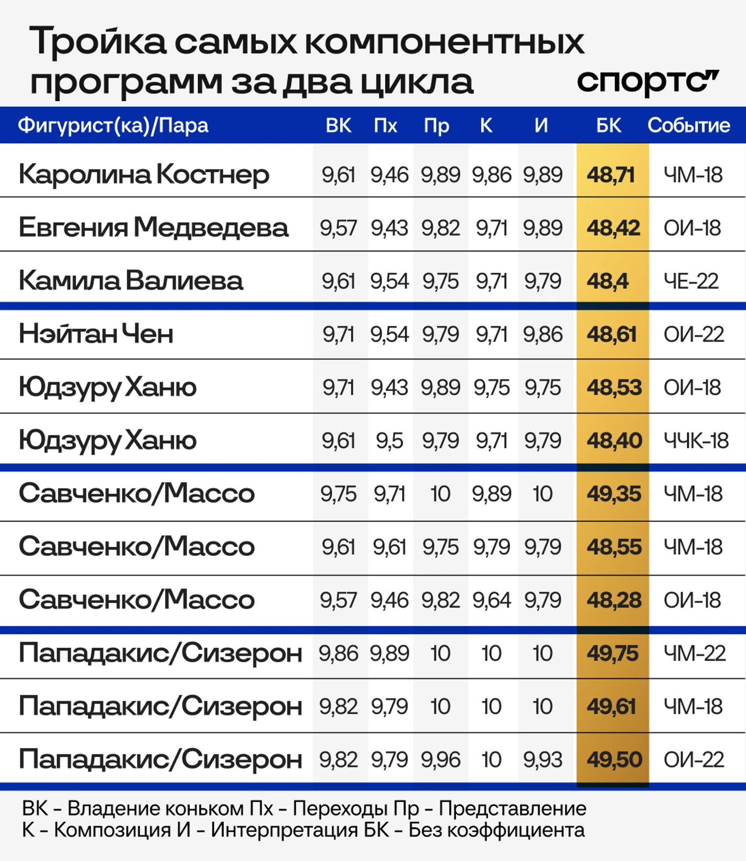 У мужчин отрыв между лидерами минимален. До Игр-2022 была эпоха дуэлей: Чен против Ханю, Ханю против Фернандеса. Однако после смены поколений нового абсолютного лидера пока нет.