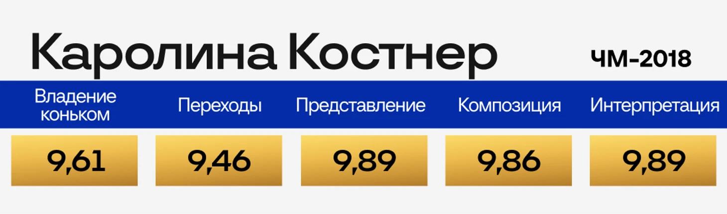 На чемпионате мира-2018 по старой системе оценивания Костнер набрала 38,97 баллов за компоненты в короткой программе (48,71 без коэффициента). Она трижды (!) преодолела значение 9,8, которое не всегда покоряется даже самым титулованным спортсменам.