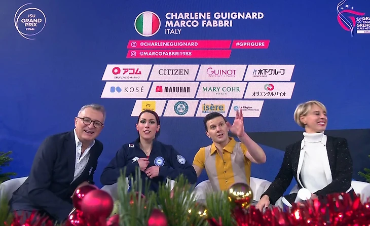 На этот экран выводят логотипы спонсоров (всех сразу), флаг и имена фигуристов. А еще ссылки на их аккаунты в соцсетях – у спортсменов, конечно, предварительно уточняют, не против ли они такой рекламы.