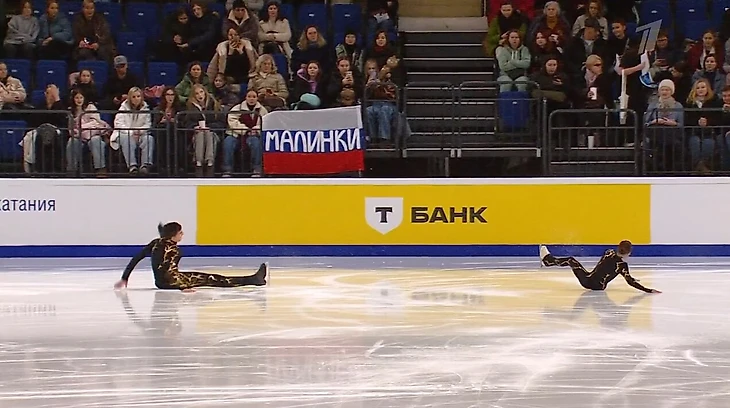 После танцев и пар команда оранжевых вышла вперед с отрывом в 7 баллов. В первой половине турнира было слишком много ошибок, особенно у парников. Вот идеальное по синхронности падение Софии Дианы Касинс и Александра Брегея.