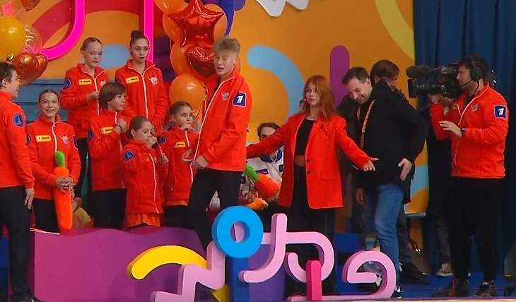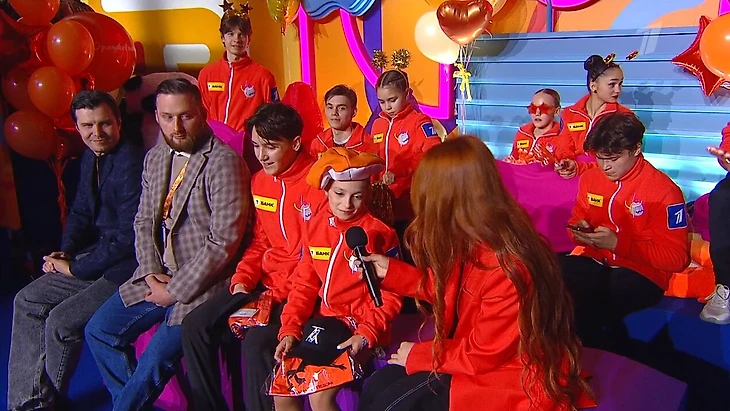 8. Не считая выступлений, эфир во многом держался на взрослых звездах. Вот Марк Кондратюк и Влад Дикиджи (они катали тут показалки) болеют за малиновых.