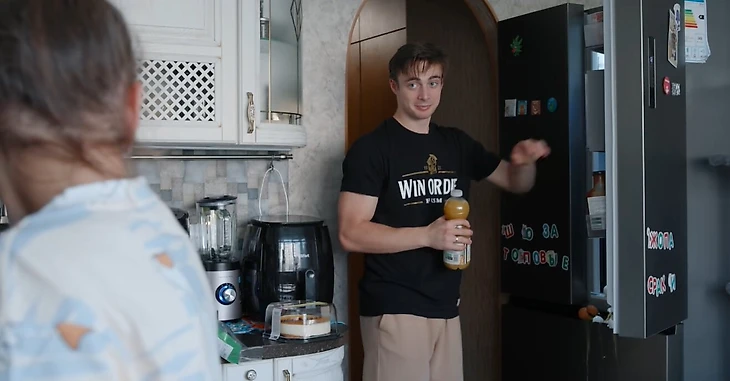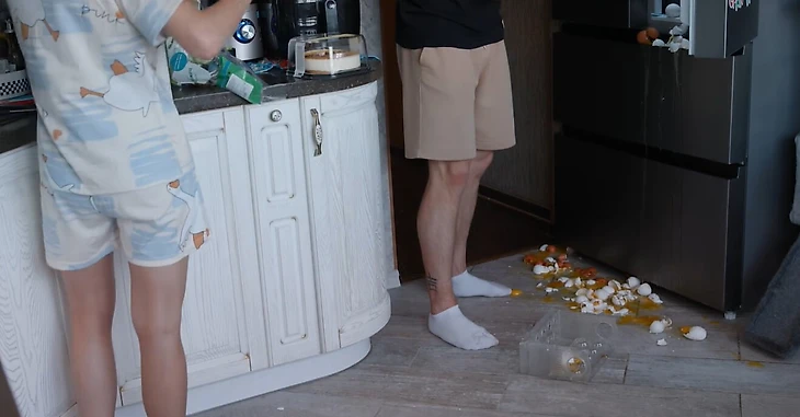 Открывает холодильник, в который Алена только что положила контейнер с яйцами, все яйца падают и разбиваются. Георгий улыбается.