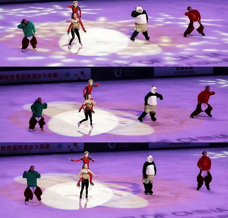 На Гран-при Китая в конце номера на лед вышли коллеги Эгадзе по сборной – Анастасия Губанова, Диана Дэвис и Глеб Смолкин, а также казахстанец Михаил Шайдоров (который явно не против вписаться в любую ледовую авантюру).