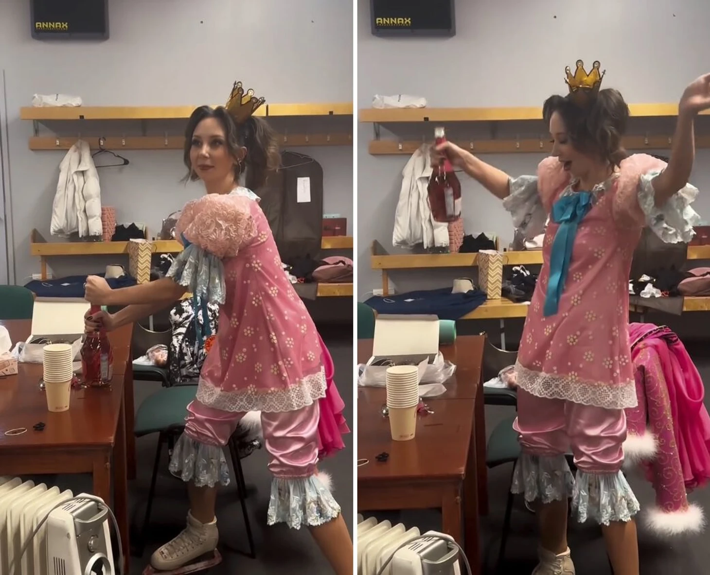 А вот Елизавета Туктамышева начала праздновать еще на шоу, так что костюм был при ней. С почетной миссией открыть шампанское справилась.
