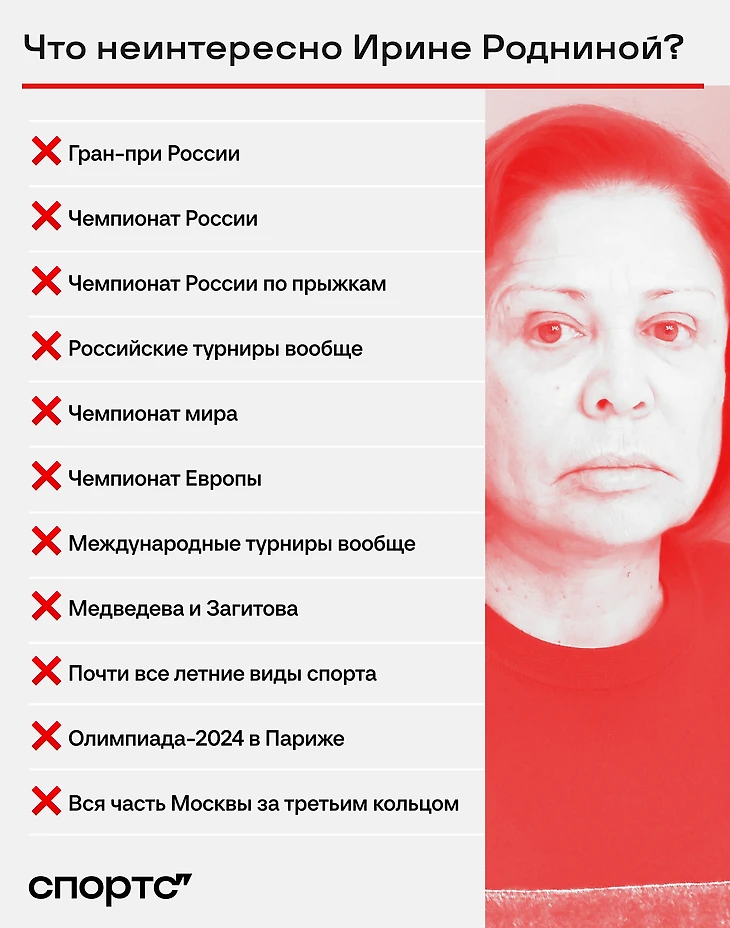 Российские турниры Роднина не смотрит, потому что «смотреть какие-то третьесортные и придуманные соревнования мне неинтересно».