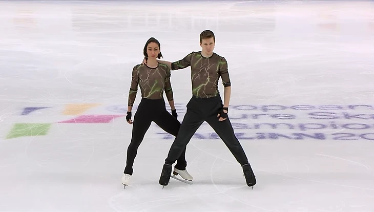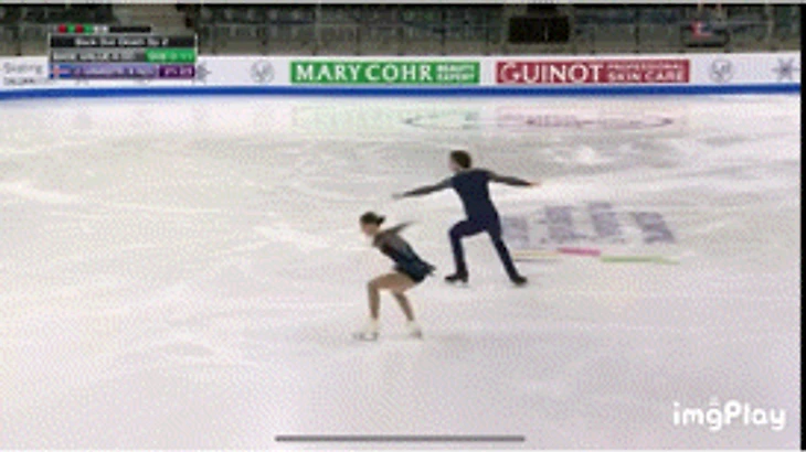 Диана и Девис Глеб Смолкин выглядели вполне неплохо. Конечно, Диана чуть медленнее катит, чем Глеб, но в целом довольно прилично. У Дианы, кстати, отличная фигура, которую подчеркивает этот шикарный комбез. А ещё у ребят в произвольной шикарный слайдинг.