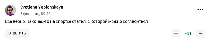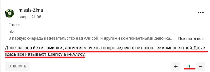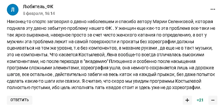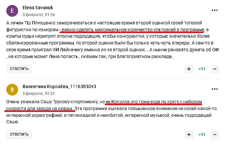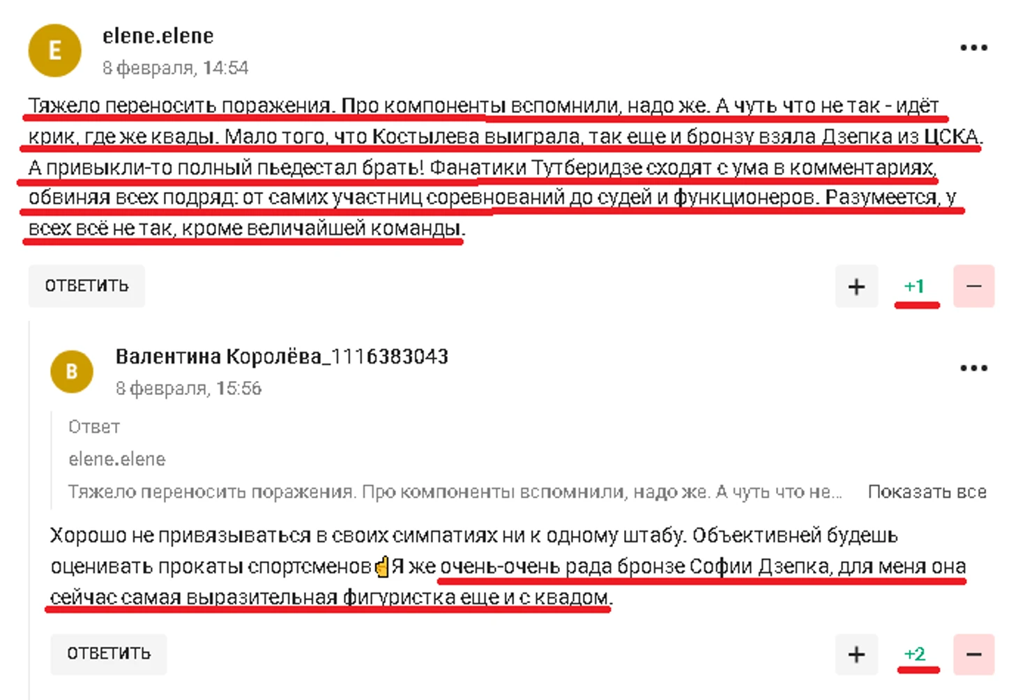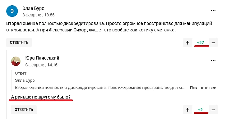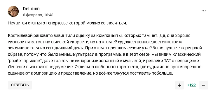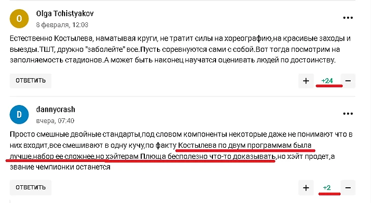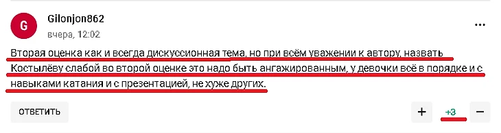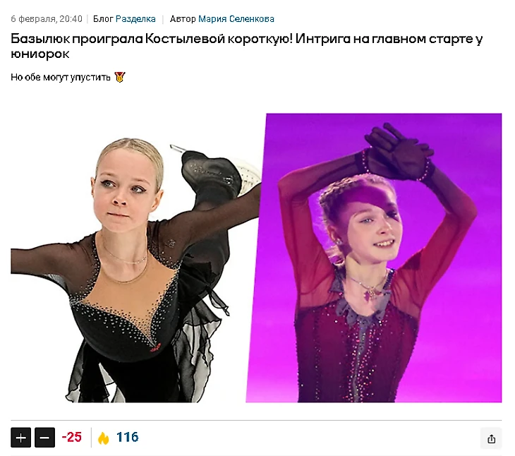 Но только ли смена акцента в заголовке (ср. «Базылюк проиграла Костылевой» и «О победе Костылевой») привела к такому резкому скачку рейтинга «реплики Селенковой» от 08.02.2025 по сравнению с предыдущей? Не только лично у меня, но и кое у кого из комментировавших данную «реплику» и к её автору, и к щедро её заплюсовавшим возникли вопросы. А именно. Почему Селенкова и Со высказались в таком негативном ключе только «о победе Костылевой»? Разве это не касается большинства других наших «победительниц» последних лет. И вообще, «она же ребёнок» почему не только автор «реплики», но и многие из её комментаторов вдруг накинулись на 13-летнюю девочку? Но главное, почему вдруг переобулись даже те, кто не так давно (по космологическим меркам, конечно) утверждали, что юная Саша Трусова своими «четверными» вывела женское фигурное катание на космический уровень.