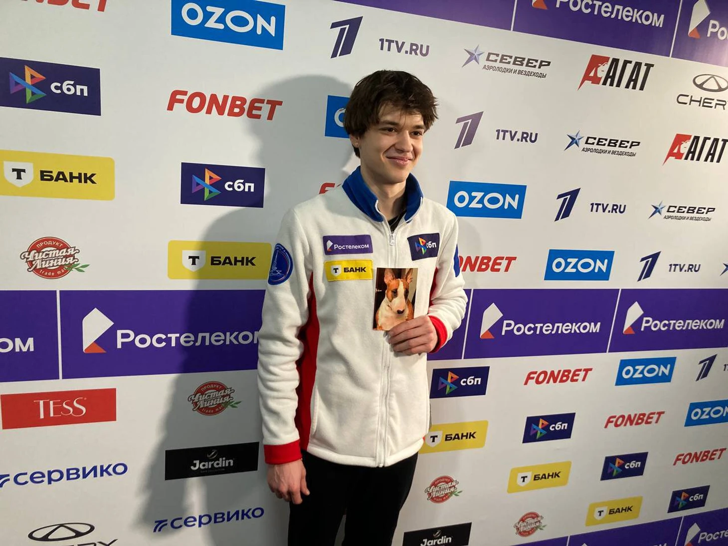 Потом он рассказал, что не умеет вызывать в себе спортивную злость, поделился историей о сломанном креплении ботинка. А еще показал фото любимой собаки – бультерьера Шарки.