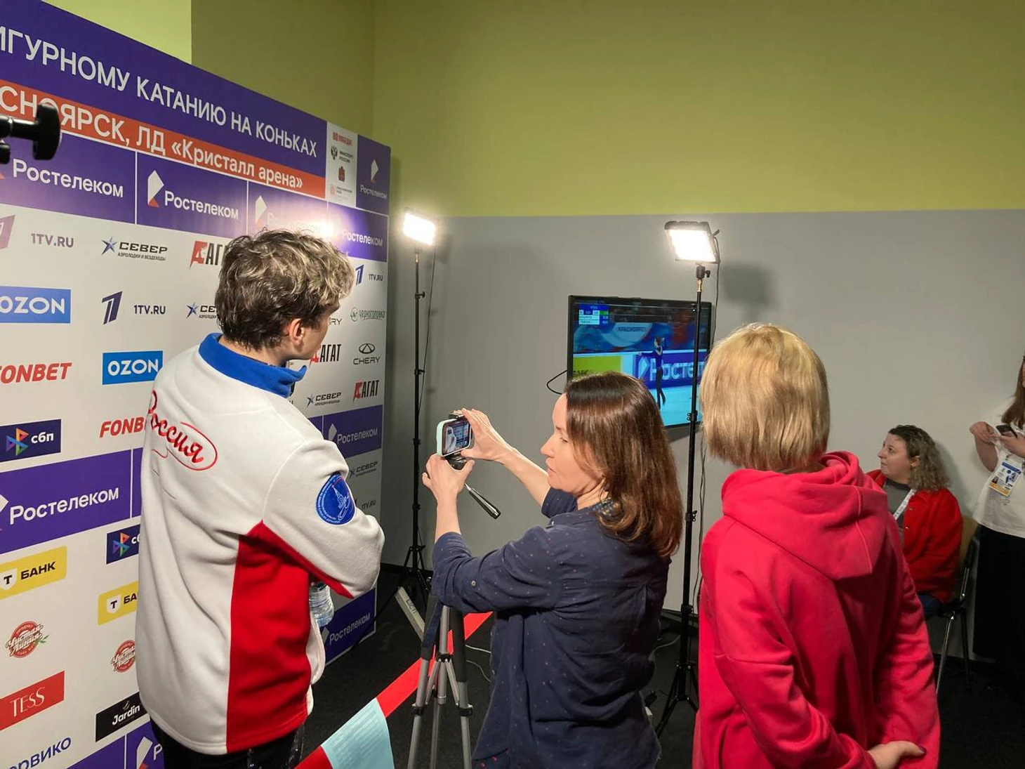 Сначала через экран в шутку отчитывала Дмитрия Алиева: «Дима, ну что ж ты так девушек расстроил». Потом рассказала, в какой гостинице живут фигуристы и с кем пора знакомиться. На предложение сесть, а не смотреть стоя, тренер тоже отшутилась: «Я постою, вдруг еще вырасту».