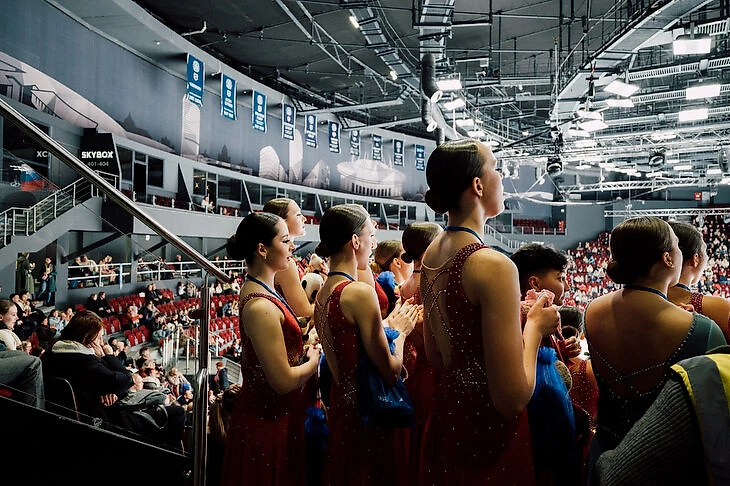 Это действительно чувствуется, даже в мелочах. Девочки из «Кристалл Айс Джуниор» выходят на подиум, где в ожидании оценок смотрят свой прокат. Они держатся за руки друг с другом и с тренерами, команда – как одно целое. Спортсменки стоят в два ряда, на них направлены камеры. Кто-то говорит: «Давайте подсядем, давайте подсядем», – и все в первом ряду подгибают коленки, чтобы камерам было видно девочек из второго ряда.