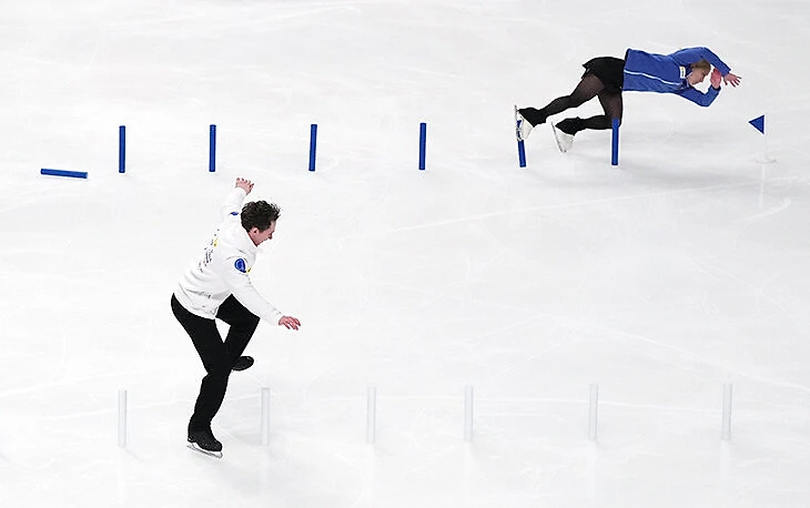 Далее последовала прыжковая эстафета – тут фигуристы себя не щадили: Макар Игнатов чуть не улетел в трубу, которая находится за льдом, а Евгений Семененко почти сбил сокомандников.