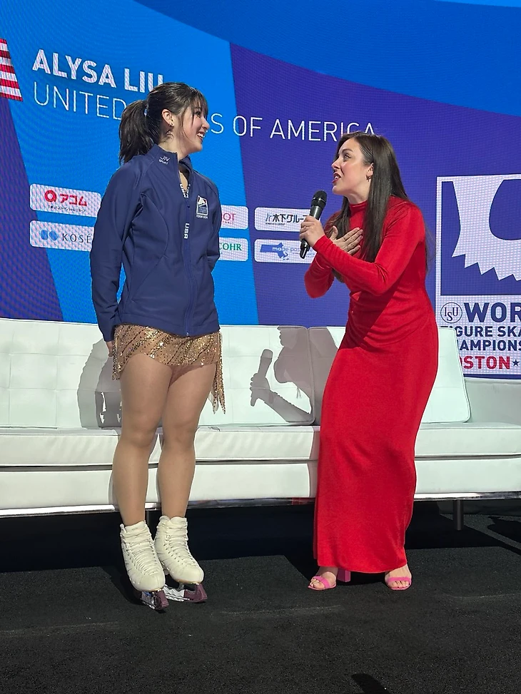 Лью еще не успела прийти в себя – и сразу первые интервью. В красном – чемпионка США Эшли Вагнер.
