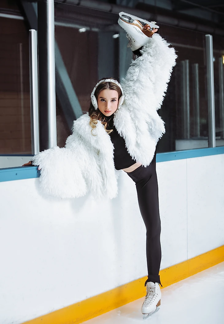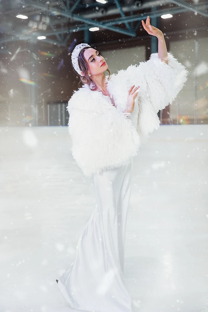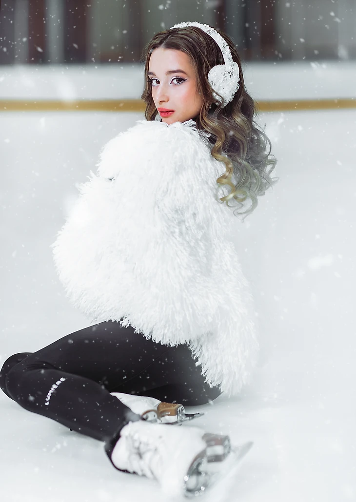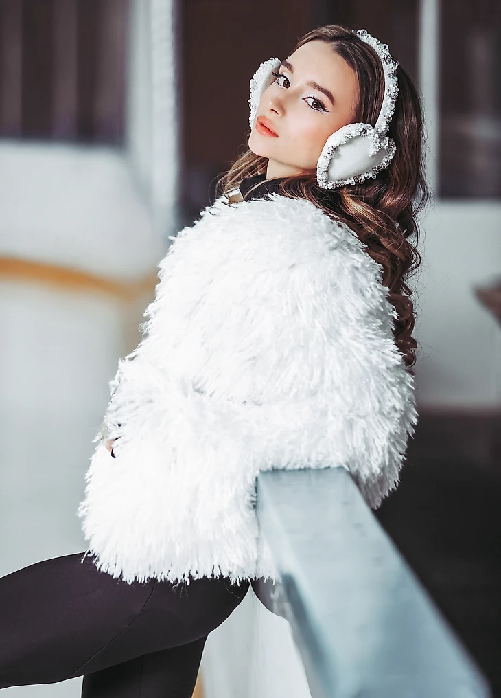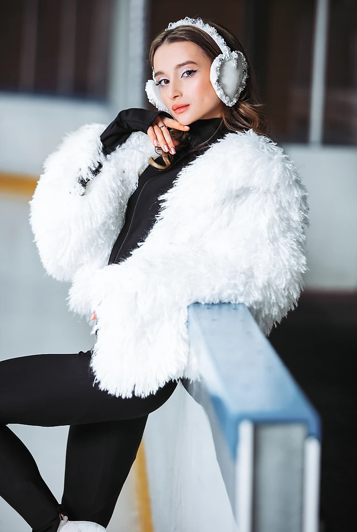 Екатерина Макаревич, стилист-имиджмейкер: «В апреле прошлого года я познакомилась с вышитыми наушниками бренда Création Pôle с сердцами в белом цвете. Они вызвали яркие ассоциации — горы, снег, лед и что-то такое еще легкое, воздушное. Моментально появилось желание их использовать. А осенью на презентации у бренда Lumiere Magique я вижу воздушную короткую белую шубку, и у меня просто в голове происходит щелчок: эта шуба и наушники должны соединиться в съемке на катке. И вот на закрытом модном показе я знакомлюсь с Сашей Прокопец, которая оказывается чемпионкой Москвы и участницей сборной России по фигурному катанию. Юная и красивая, с широко распахнутыми глазами, она просто идеально подходит под образ девушки в моей голове: в наушниках и шубке на катке».