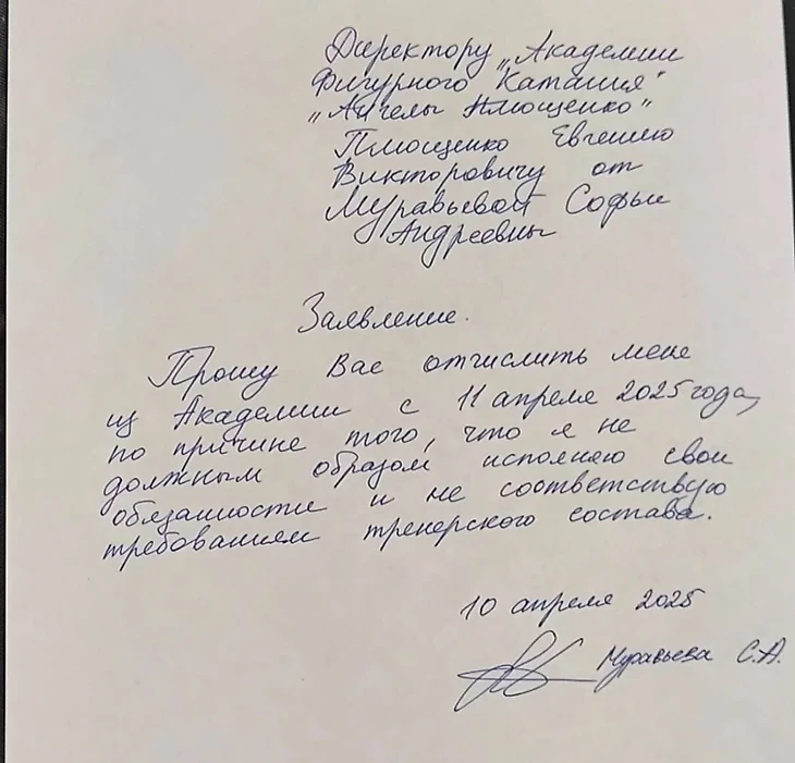 Вместе с релизом «Ангелы» выложили фото с заявлением Муравьевой (написано от руки), и вот там самое интересное: «Прошу вас отчислить меня из Академии с 11 апреля 2025 года по причине того, что я не должным образом исполняю свои обязанности и не соответствую требованиям тренерского состава».