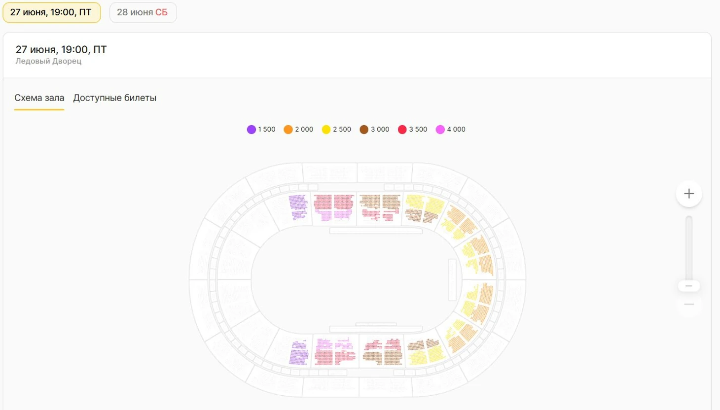 Даже визуально по скрину видно, что куплено в лучшем случае 10-15% от всех мест (секторы слева и наверху в продажу не поступали). Хотя цены демократичные: от 1500 до 4000 рублей.