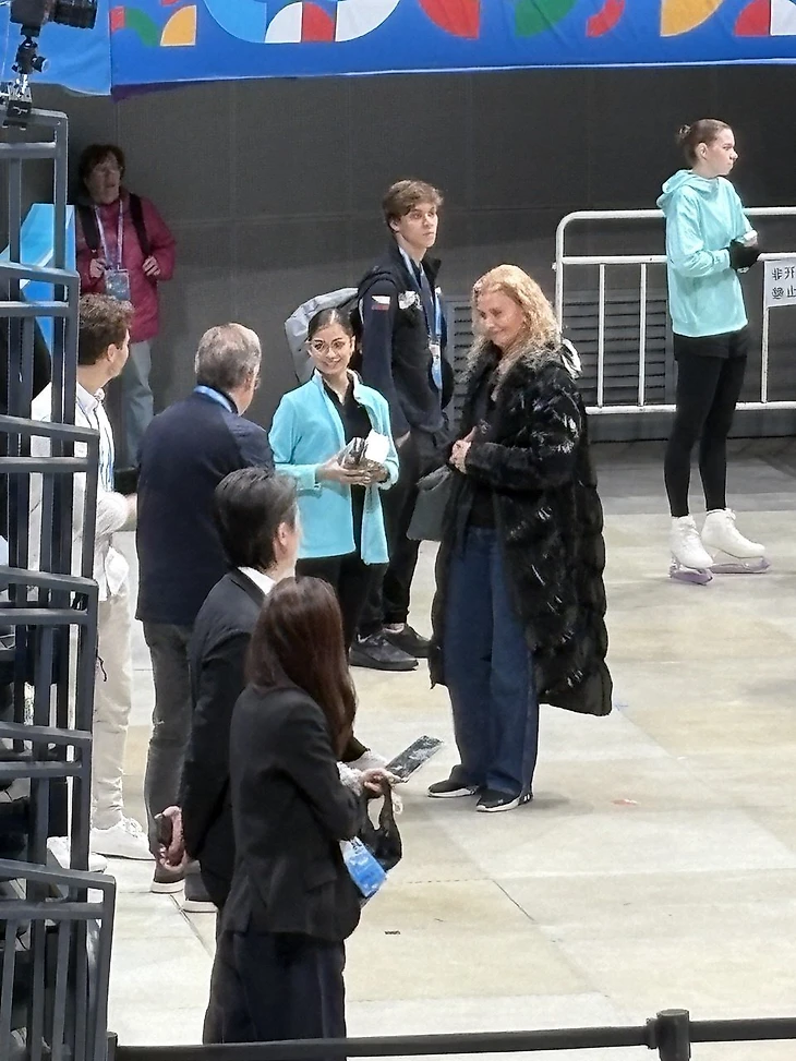 Зато Тутберидзе общалась с тренерами и журналистами (она не нейтральный тренер, поэтому пресса не под запретом) и выглядела расслабленной. К комментатору Теду Бартону и вовсе подходила в танце.