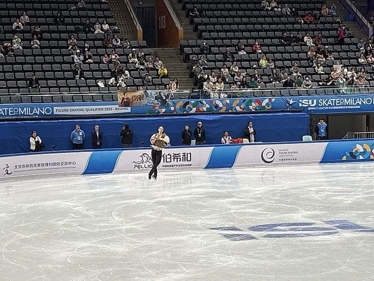 Подготовка к короткой программе получалась насыщенной. Рейс из Петербурга приземлился в Пекине за 5 минут до начала первой официальной тренировки. Вторую Гуменник тоже пропустил. Так что возможности опробовать соревновательную арену не было вплоть до дня выступления: тренировка накануне старта проходила на запасном катке.