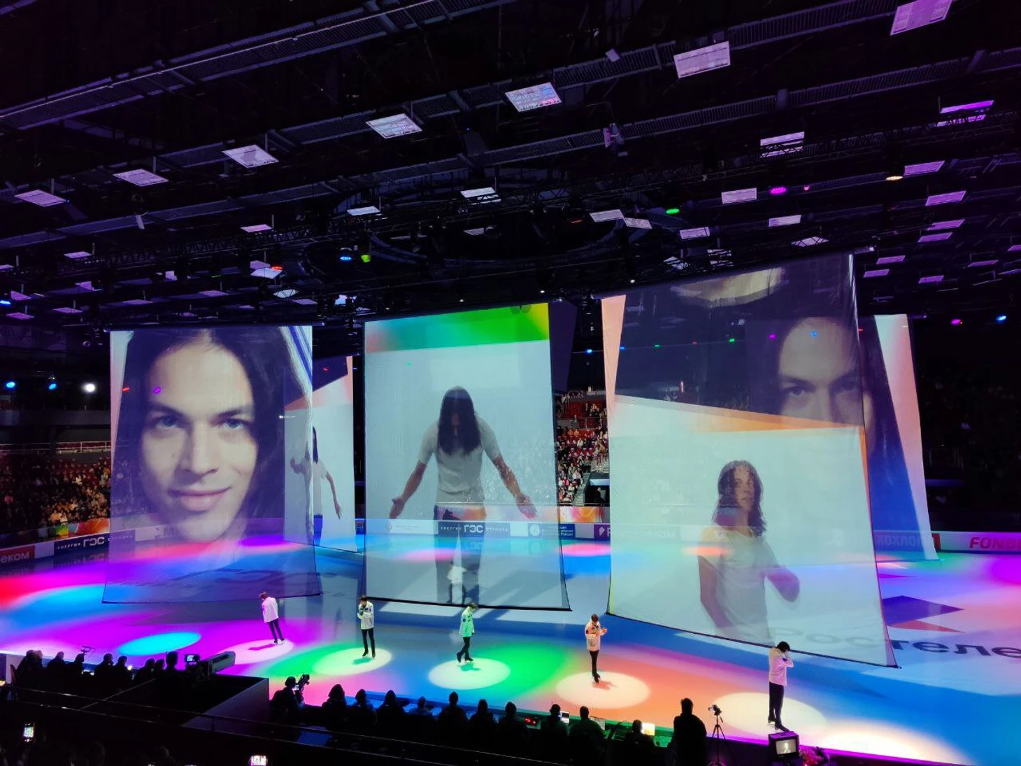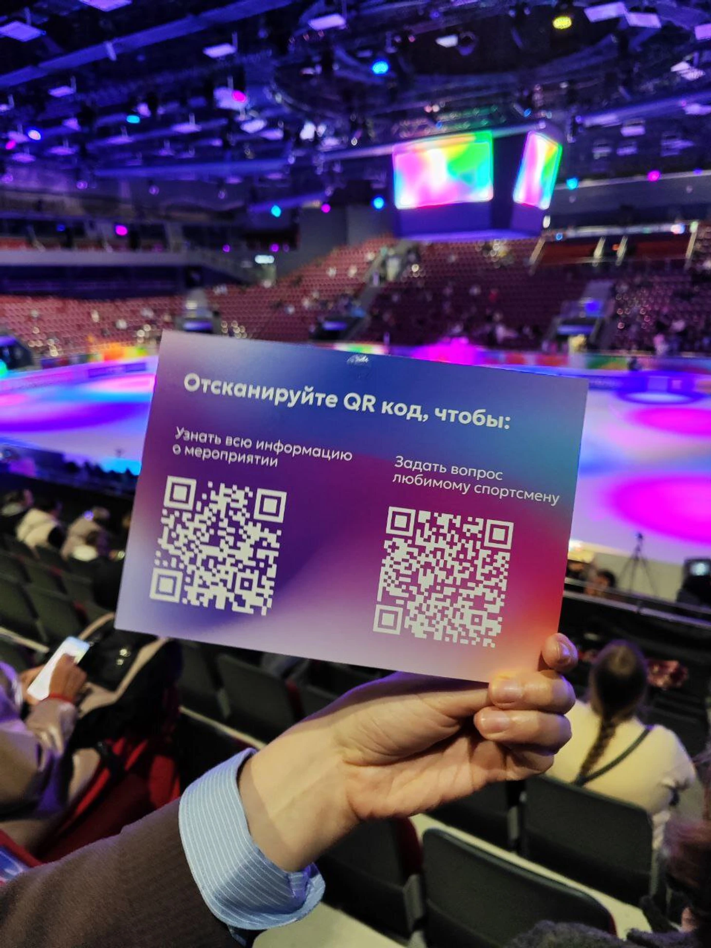 С точки зрения обвеса соревнований все не так плохо – кавер-группа на разогреве, QR-коды на креслах (один вел на телеграм-канал Первого, второй – на форму для вопроса фигуристам), огромные пять блоков для проекции (замена led-бортов), новые видеозаставки с фигуристами.